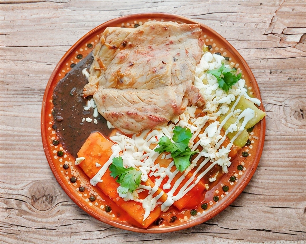 Chilaquiles con crema, queso, acompañados con frijoles y proteína a elegir pollo o bistec.