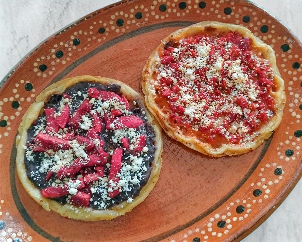 Tortilla de masa de maíz, preparada con salsa de tomate o frijol y queso espolvoreado