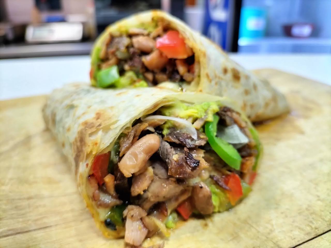 Burrito de gran tamaño con suave bistec a la plancha, frijoles refritos, queso derretido y el toque de la casa.