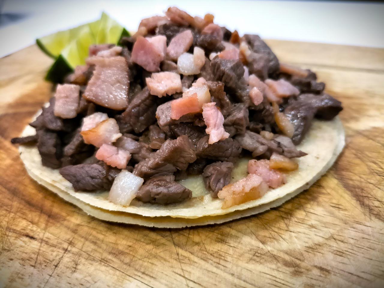 Taco de delicioso bistec, acompañado con tocino, maridaje perfecto!