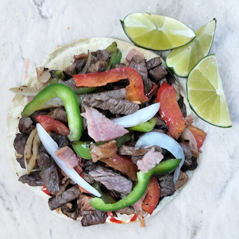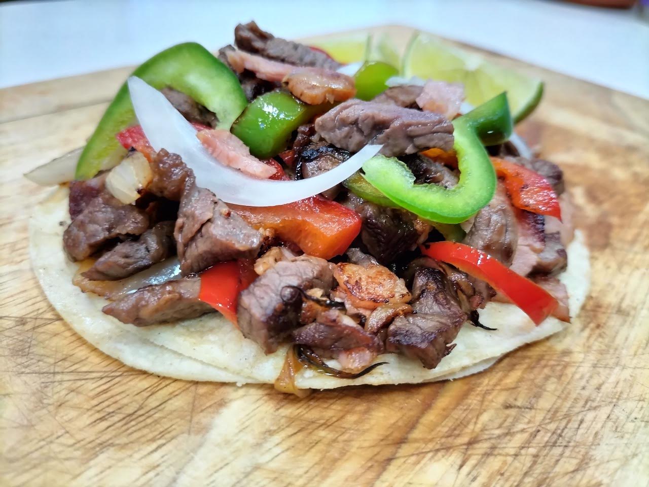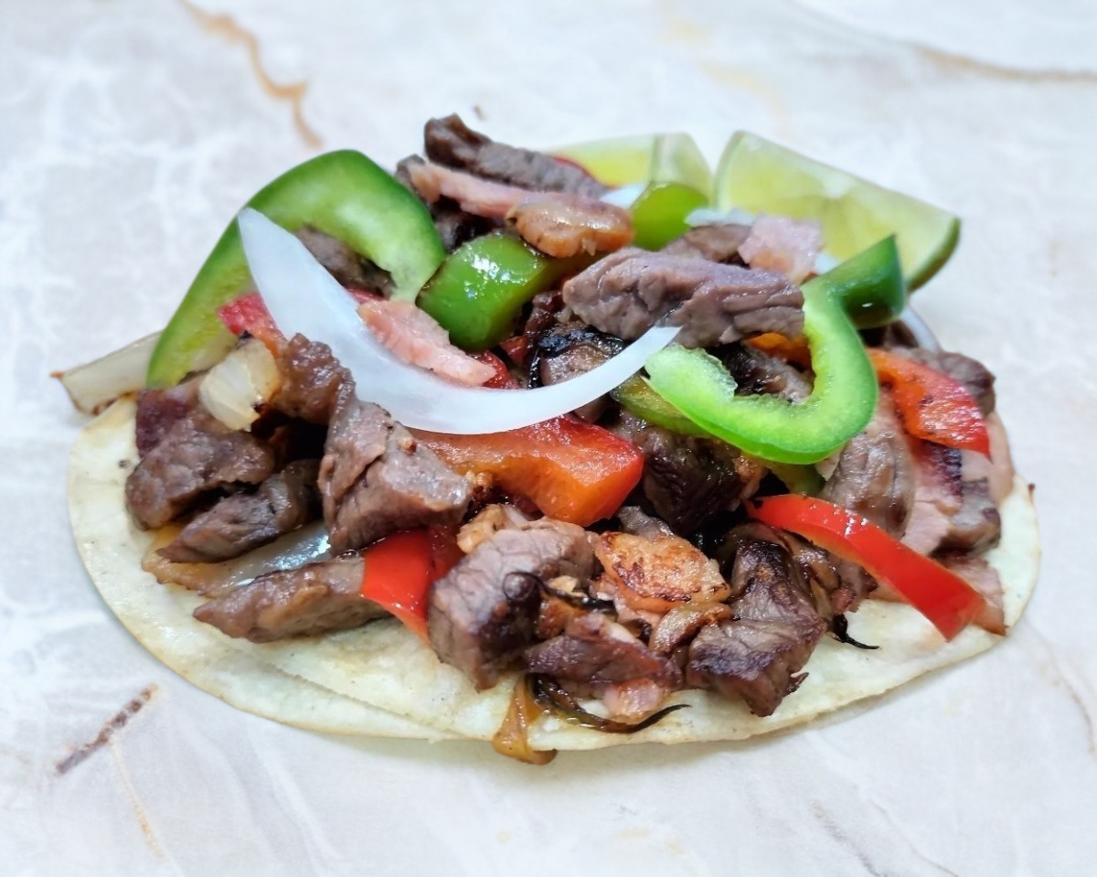 Exquisito taco de suave y jugoso sirloin con pimientos, cebolla, tocino y todo el sabor de Los Meros Meros.