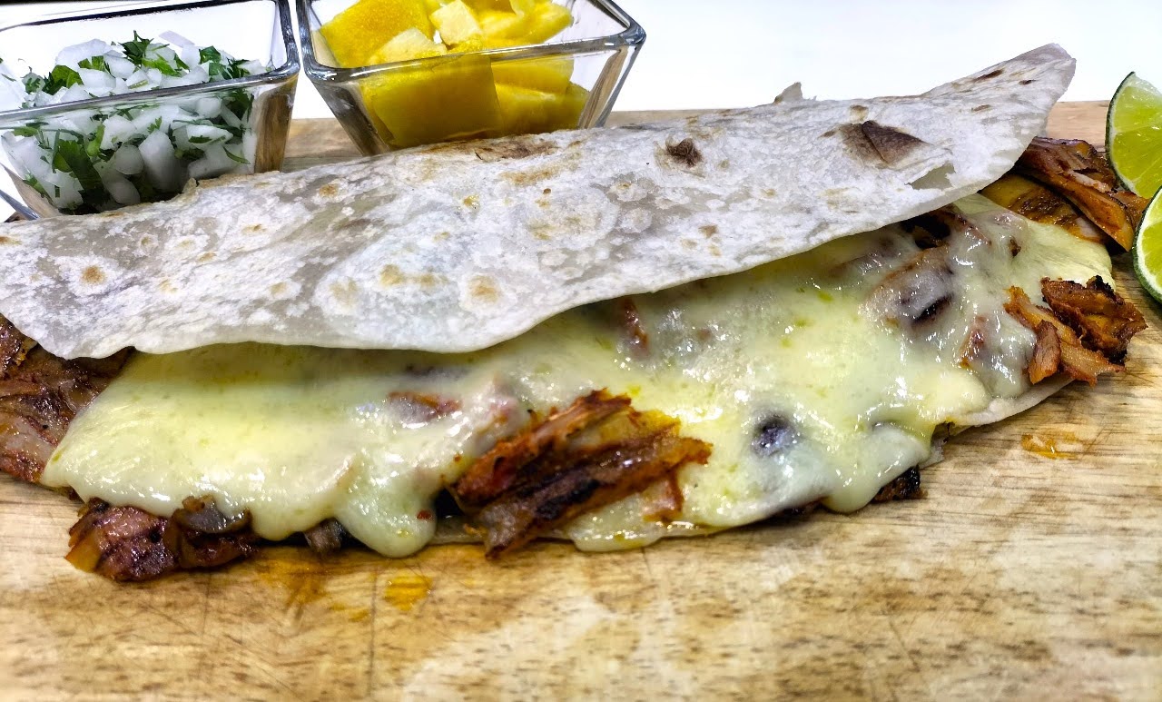 Tortilla de harina rellena de carne al pastor con piña y queso derretido, doradita al comal.