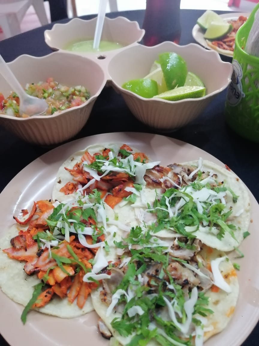 Carne de cerdo al pastor, acompañado de cilantro, repollo, limones, tortillas, salsa verde y salsa mexicana.