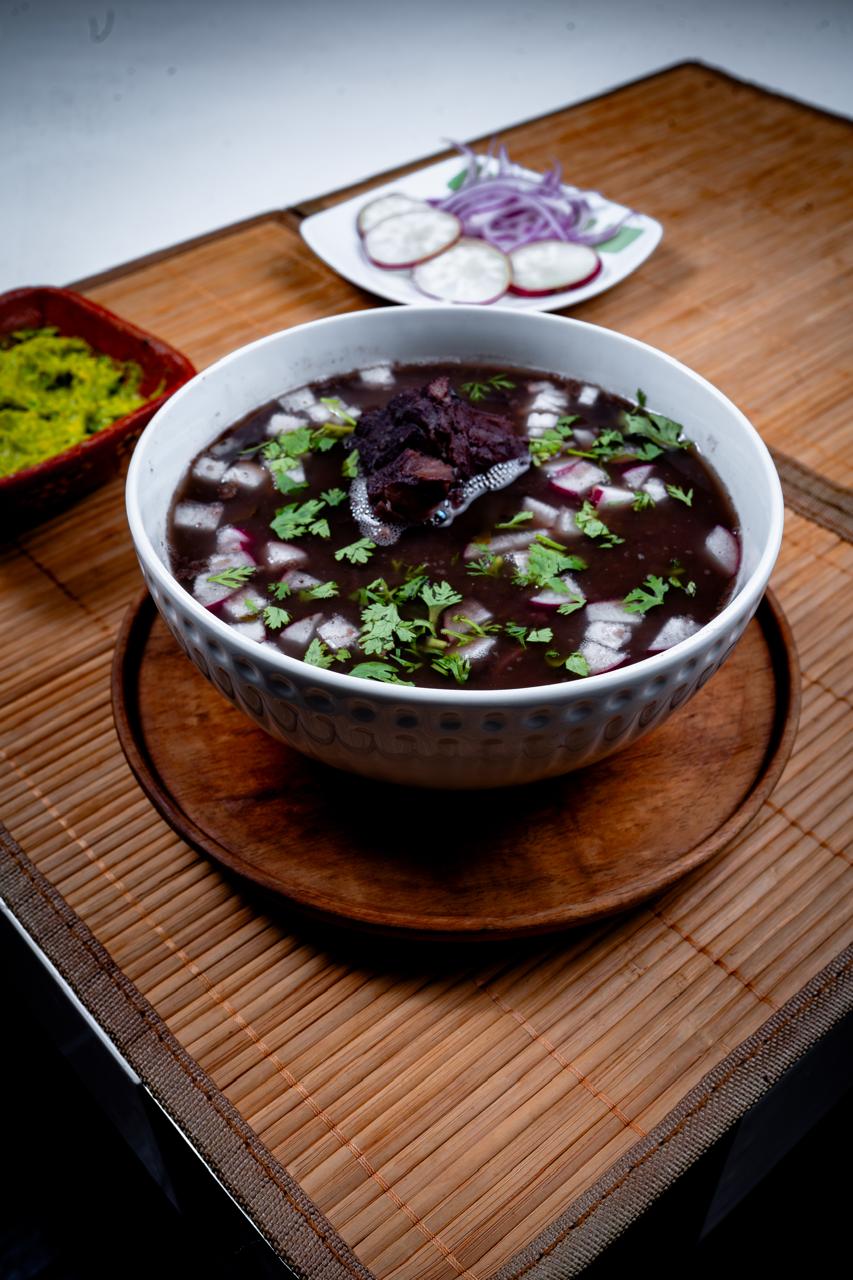 En maya BU´UL KEKEN, rico caldo de frijol acompañado con carne de cerdo, cebollita, rábano, cilantro finamente picado, aguacate, tortillas y salsa roja.