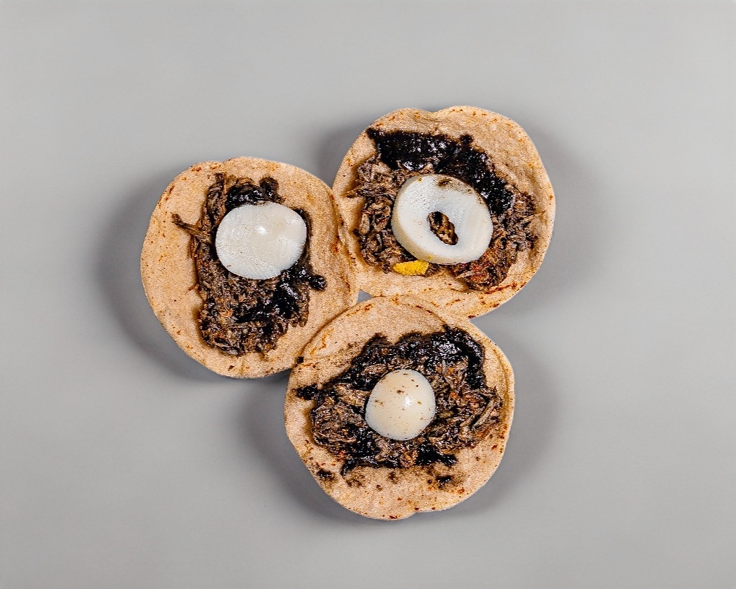 Delicioso taco a base de tortilla de maiz, pavo y el tradicional recado negro, acompañado de huevo cocido y su ricas salsas de habanero al gusto.