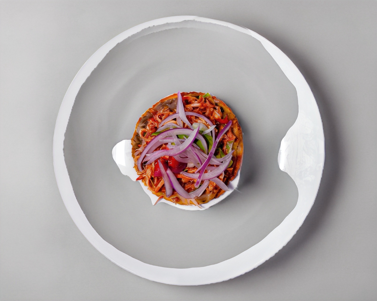 Base tortillas tostaditas con una rica salsa roja (opción salsa picante), acompañado de nuestro tradicional Poc - Chuc (bistec de cerdo asado y marinado con naranja agria), una pizca de cilantro, cebolla, crema, rábano curtido, aguacate y queso desmoronado.