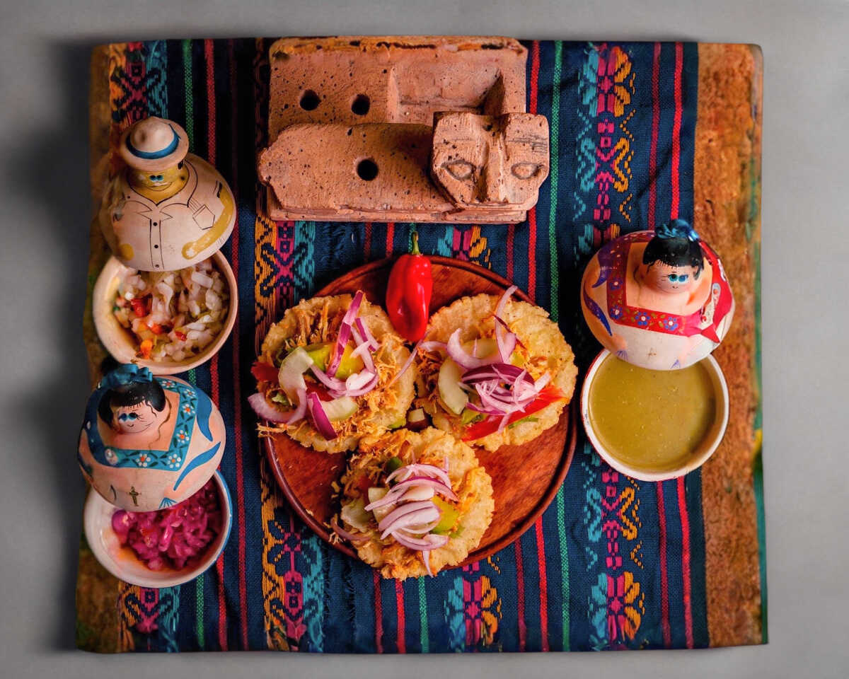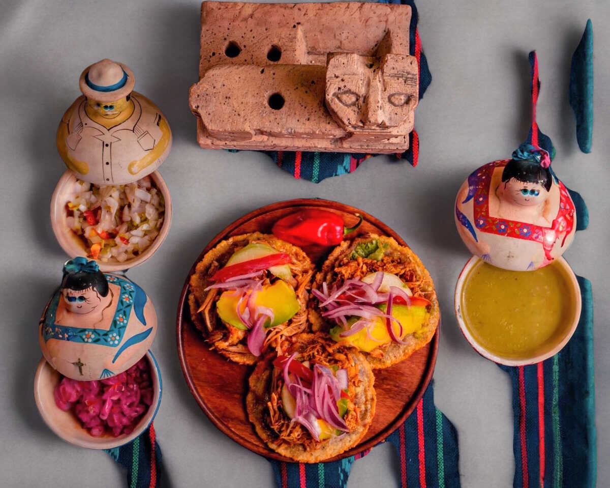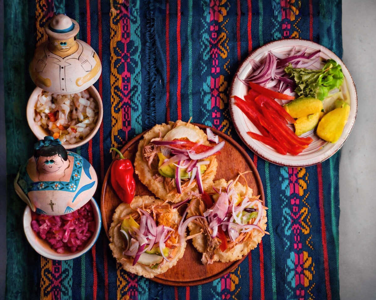 Rica tortilla hecha a mano rellena de frijol, encima su rica carne de cochinita pibil bañada en su jugo, acompañado de tomate, pepino, lechuga, aguacate y cebolla morada.