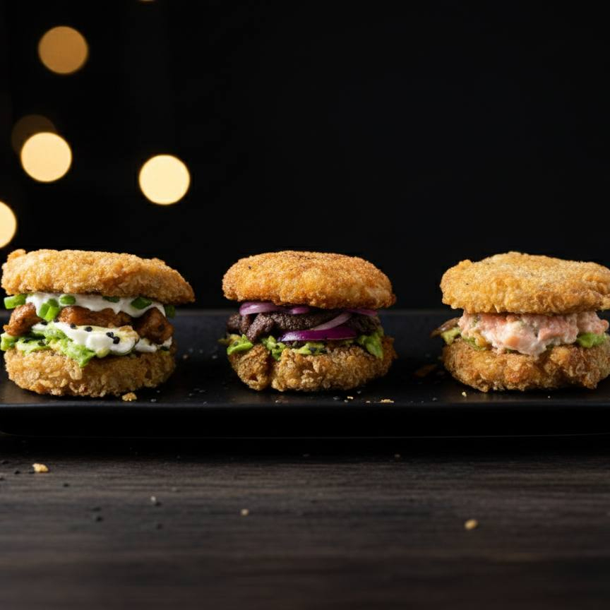 ¡Tres experiencias en un solo plato! disfruta de 3 mini hamburguesitas gourmet sin pan con arroz frito de tapas: 1 de arrachera teriyaki con cebolla morada, 1 de pollo hawaiano con queso crema y 1 de atún spicy con tampico. todas servidas con base de aguacate, cebolla crunchy y ajonjolí.
