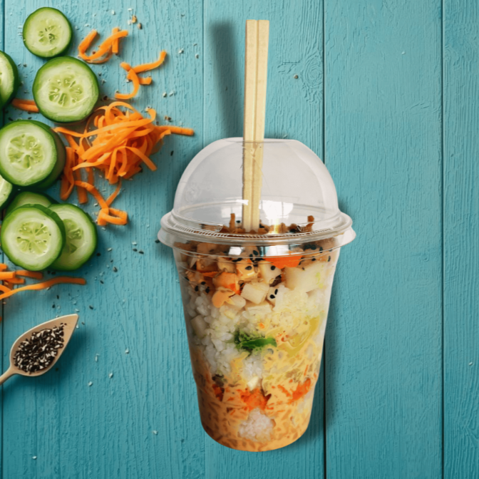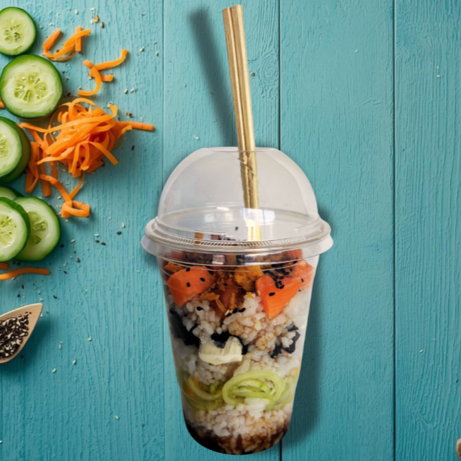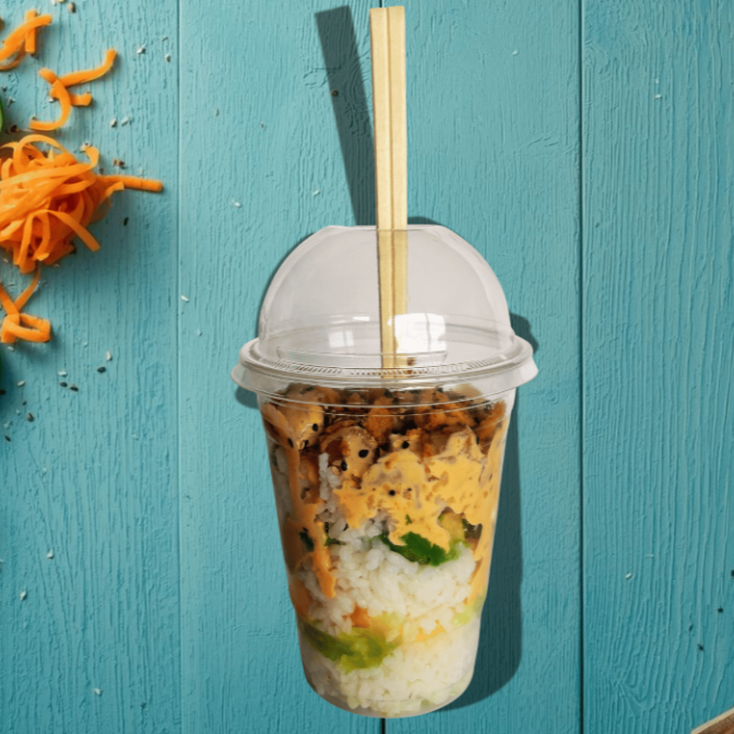 Poke bowl práctico para comer en cualquier lugar. Lleva arroz, surimi, pepino, zanahoria, aguacate, queso crema, cebolla crunchy, ajonjolí y spicy mayo. Fresco, cremoso y delicioso.