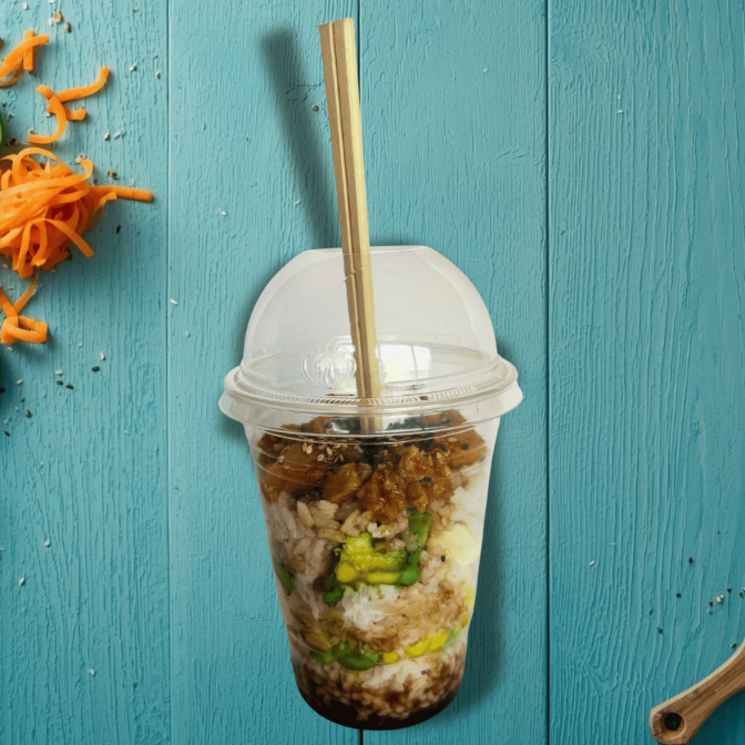 Poke bowl práctico y delicioso para comer en cualquier lugar. Lleva arroz, pollo hawaiano, elotitos, aguacate, queso crema, edamames, ajonjolí y teriyaki. Fresco, cremoso y con un toque dulce.