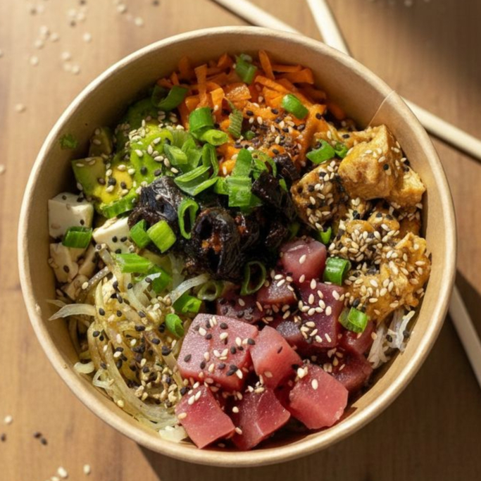 Poke bowl práctico y delicioso para comer en cualquier lugar. Preparado con arroz, atún fresco, aguacate, pepino, queso crema, mango, cebolla crunchy, ajonjolí y spicy mayo. Fresco, cremoso y con un toque picante que lo hace perfecto para llevar.