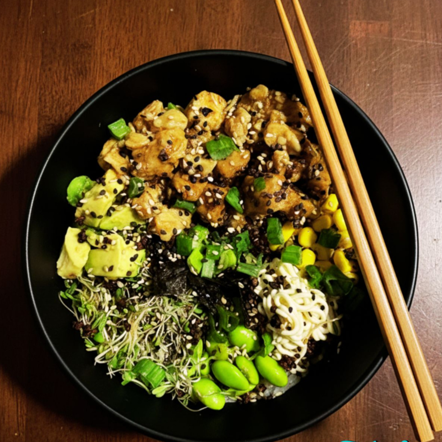 Base de arroz, pollo, elotitos, queso crema, aguacate, adamames, germinado y alga. Bañado en salsa ponzu y teriyaki con chispas de ajonjolí, cebollín y chips de ajo.