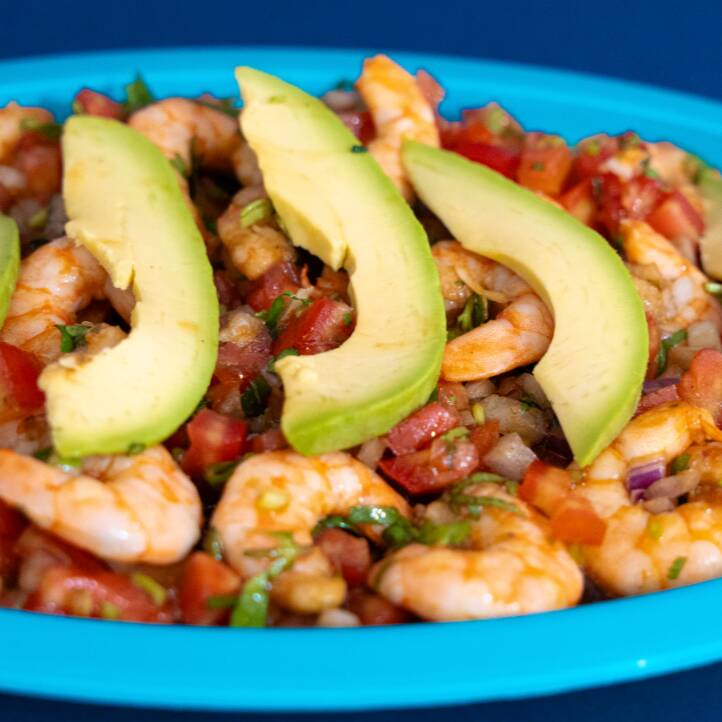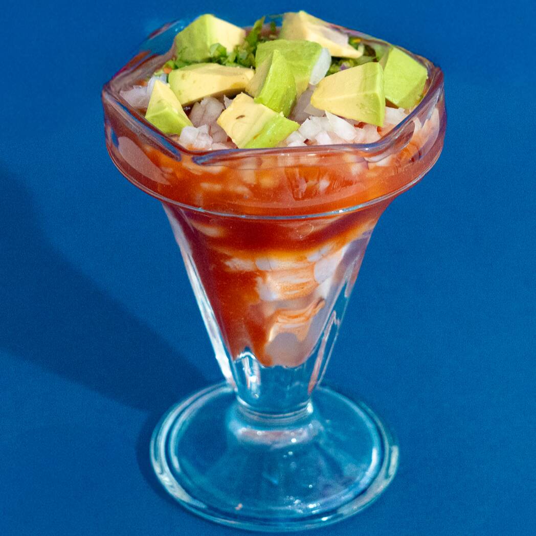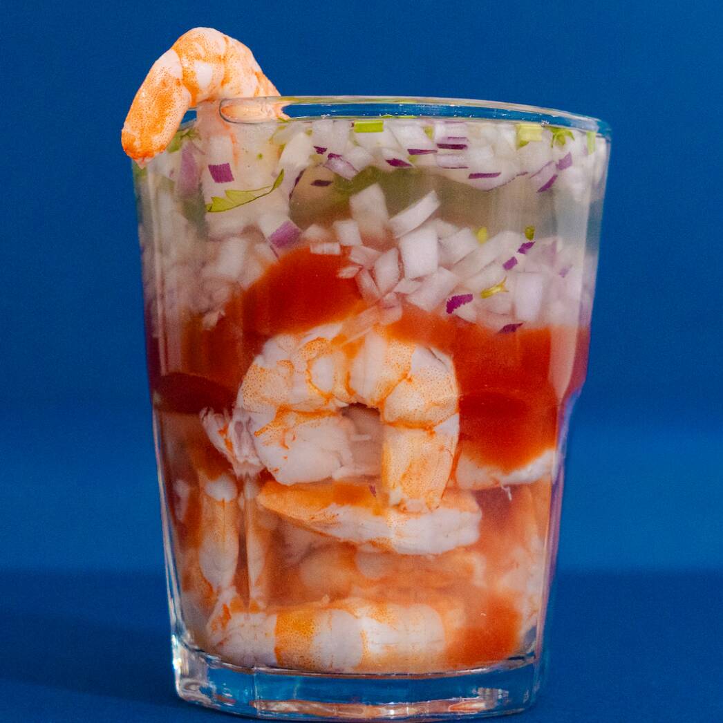 camarón, aguacate, tomate, cebolla morada, cilantro & salsa inglesa.