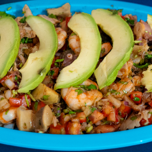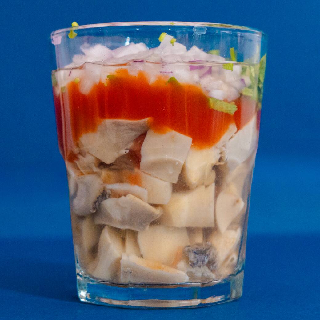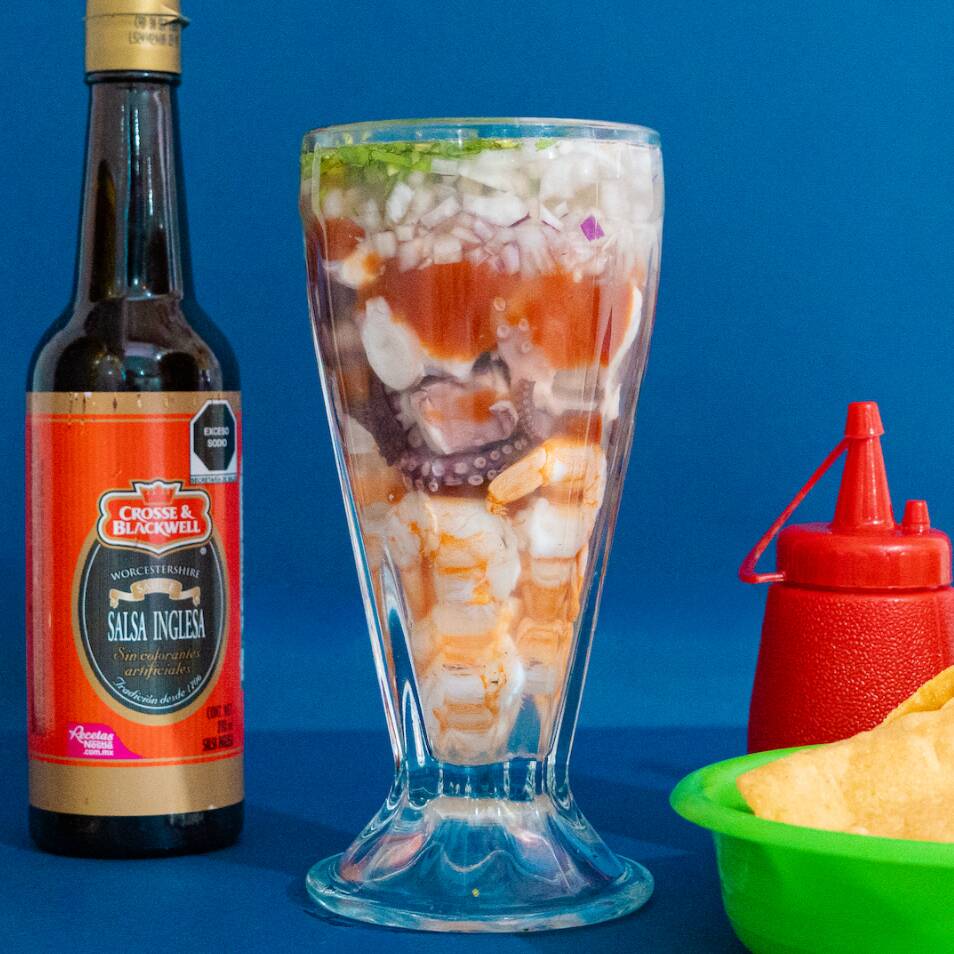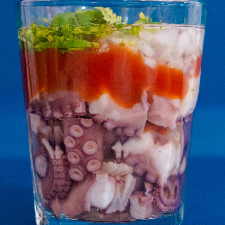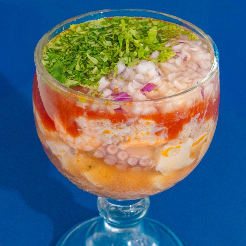 Camarón, pulpo, jaiba, caracol, aguacate, cebolla morada, tomate, salsa inglesa y toque de limón.