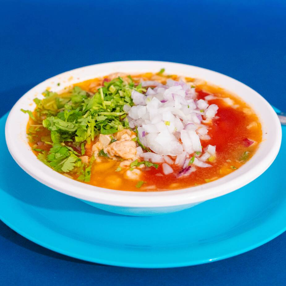 Ceviche, camarón, pulpo, caracol, jaiba y ostión. Con toque de limón, catsup, cebolla morada, cilantro, aceite de oliva y salsa inglesa.