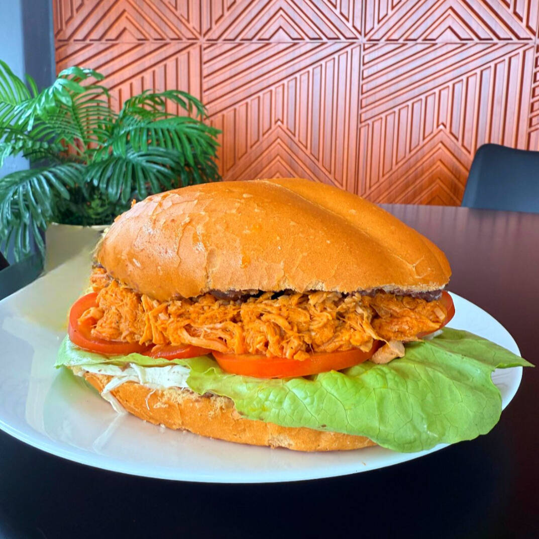 delicioso pan telera con mayonesa y frijoles rellena de lechuga, tomate, rica carne de cochinita, acompañada de cebolla curtida
