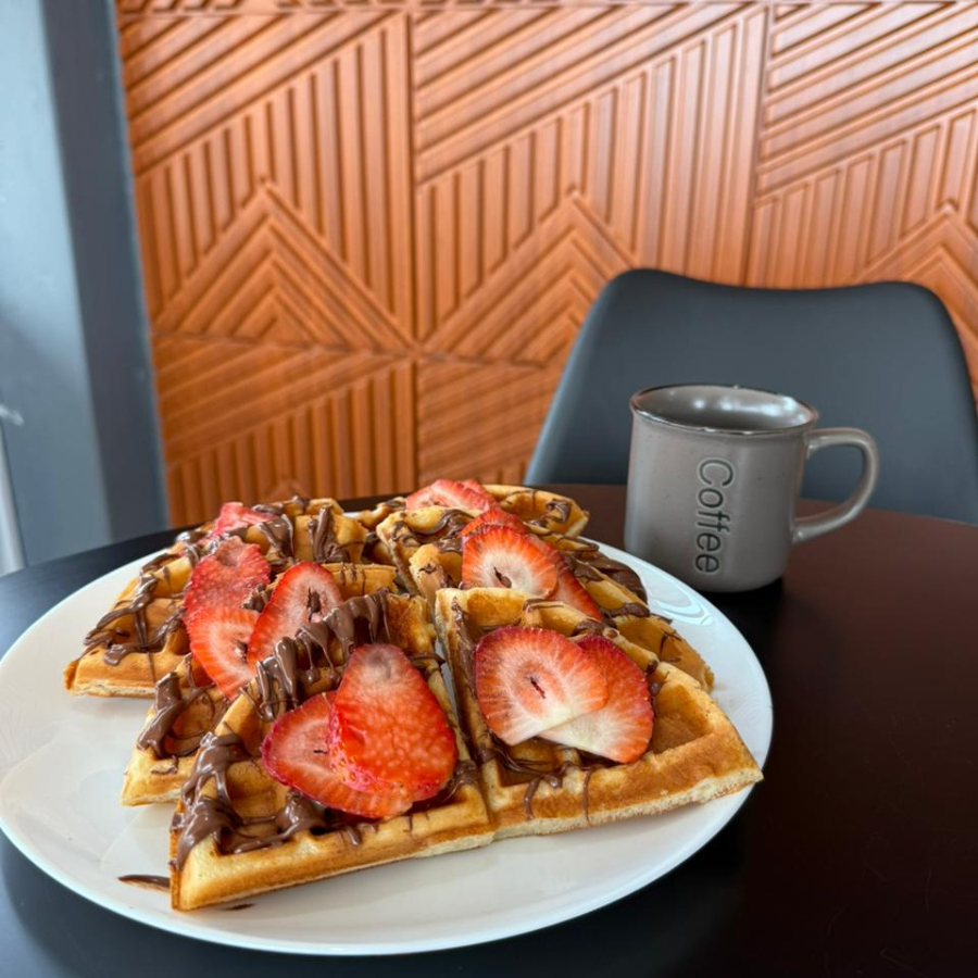 Deliciosos Waffles con fresa y platano bañados en miel o lechera