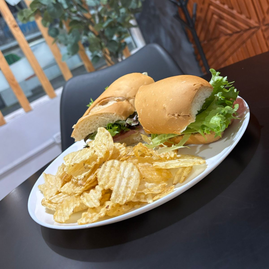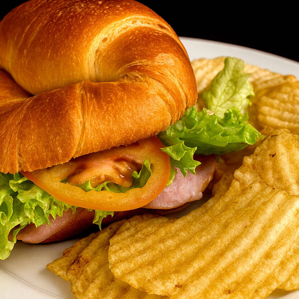 delicioso pan de cuerno danes con mayonesa, una capa de lechuga, jamon de pierna, queso manchego, tomate acompañada de papas tipo chips