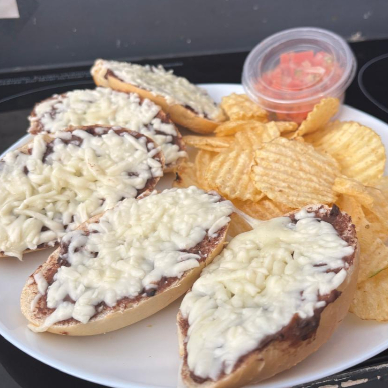 Ricos bolillitos con frijol, queso manchego gratinado acompañado de papas tipo chips y pico de gallo
