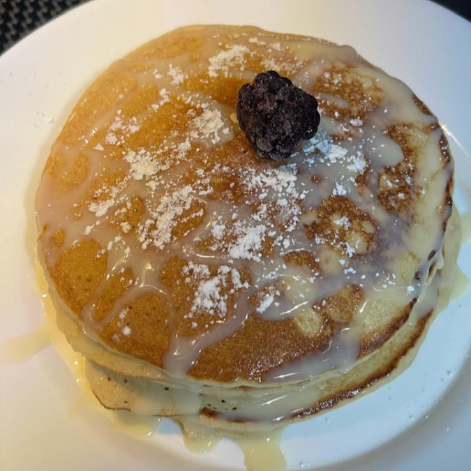 3 piezas de hot cakes bañados con miel o lechera y espolvoreados con azucar glass