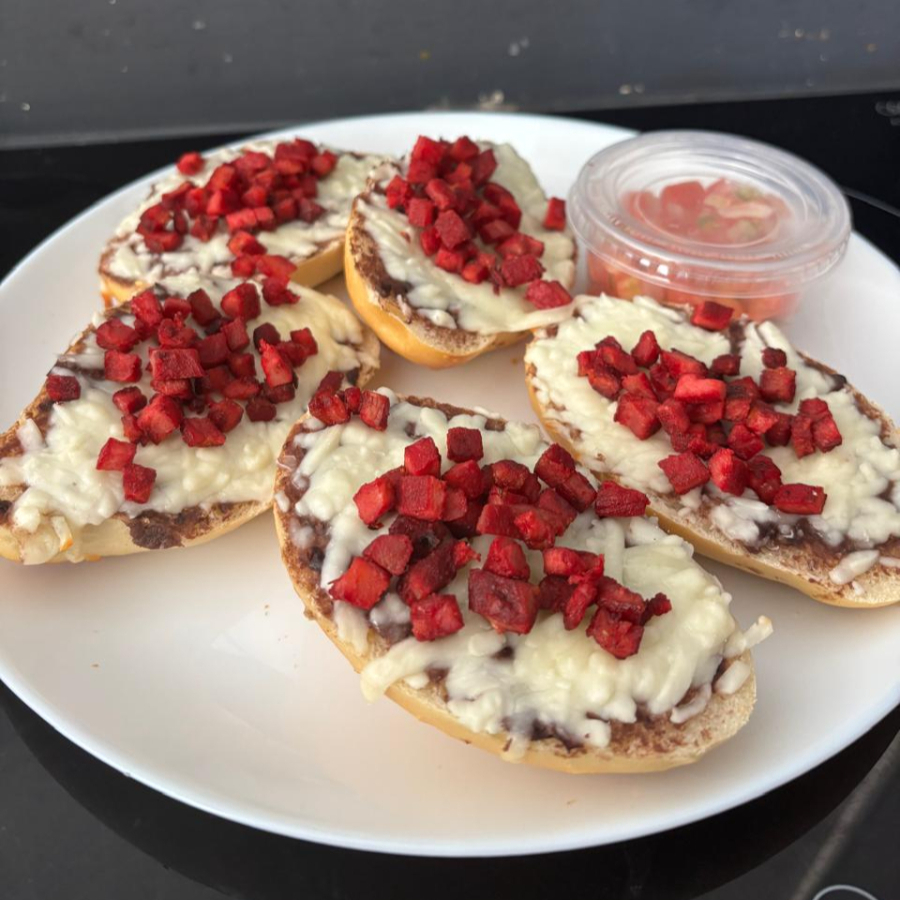 Ricos bolillitos con frijol, queso manchego gratinado con carne de chinameca acompañado de pico de gallo