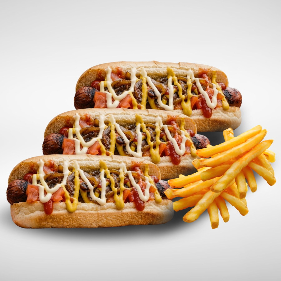 3 Dogos Classics, preparados con pan, salchicha, tomate, cebolla caramelizada, mayonesa, cátsup, mostaza y porcion de papas a la francesa naturales.