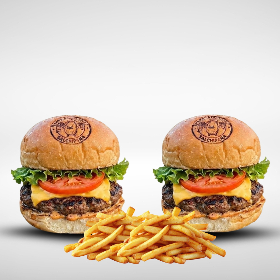 2 Burgers Classics, preparadas con pan artesanal, 150gr de sirloin, queso amarillo, lechuga, tomate, cebolla caramelizada, mayonesa y porción de papas a la francesa naturales.