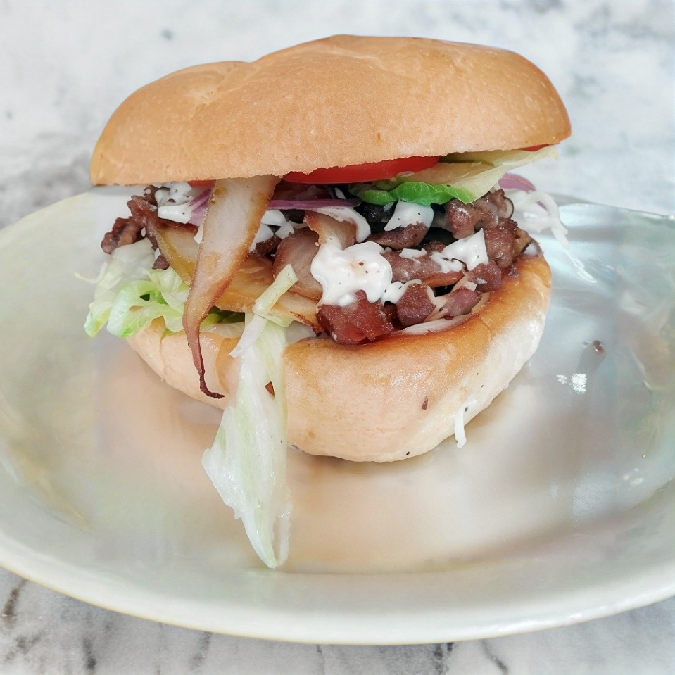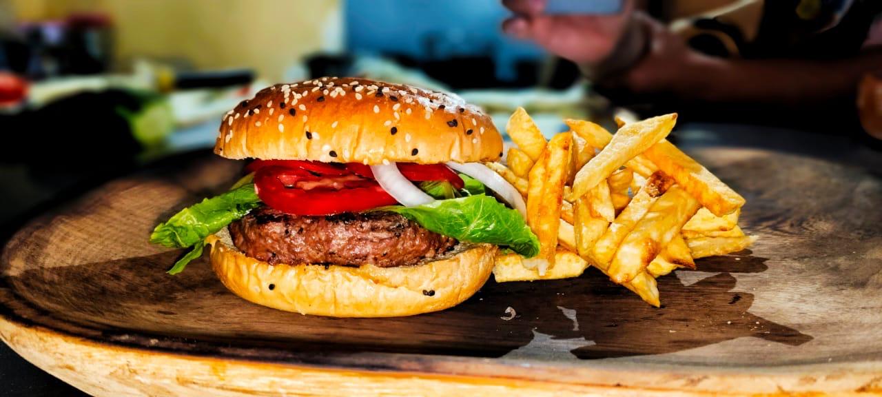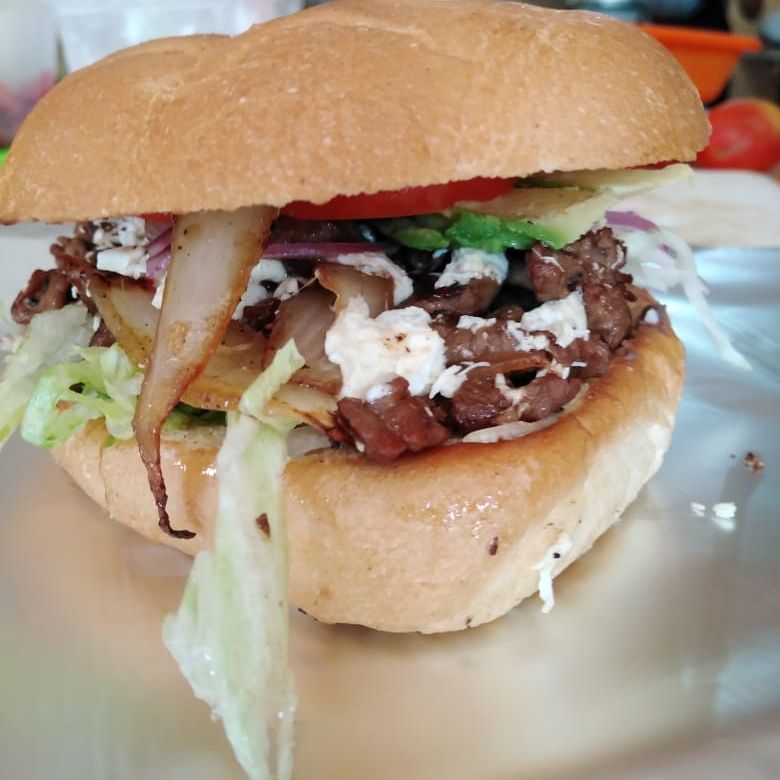Una hamburguesa: pan bimbollo parrillero con 180 gramos ( sirloin) jamón, queso manchego, lechuga, tomate , cebolla frita y aguacate