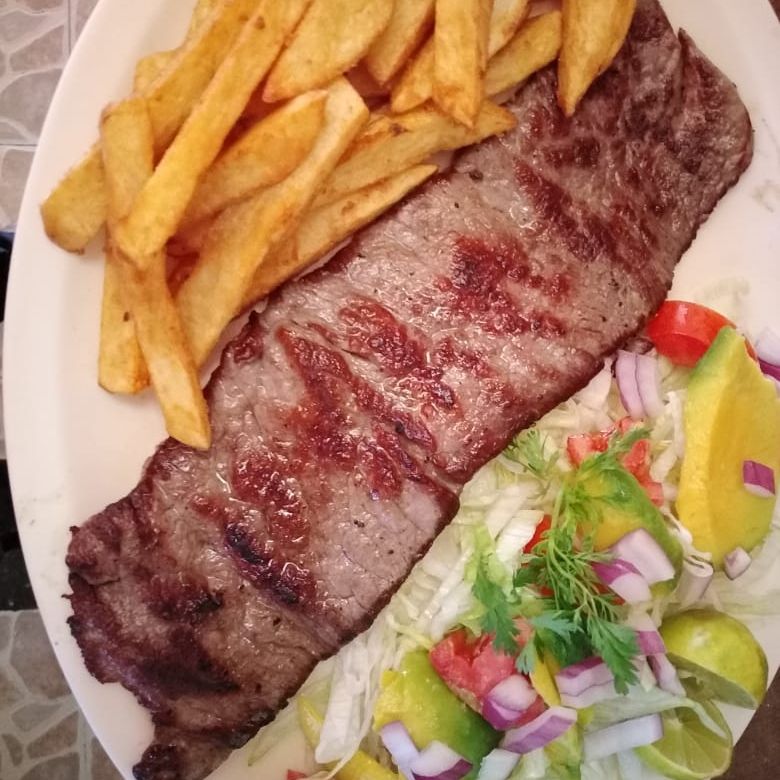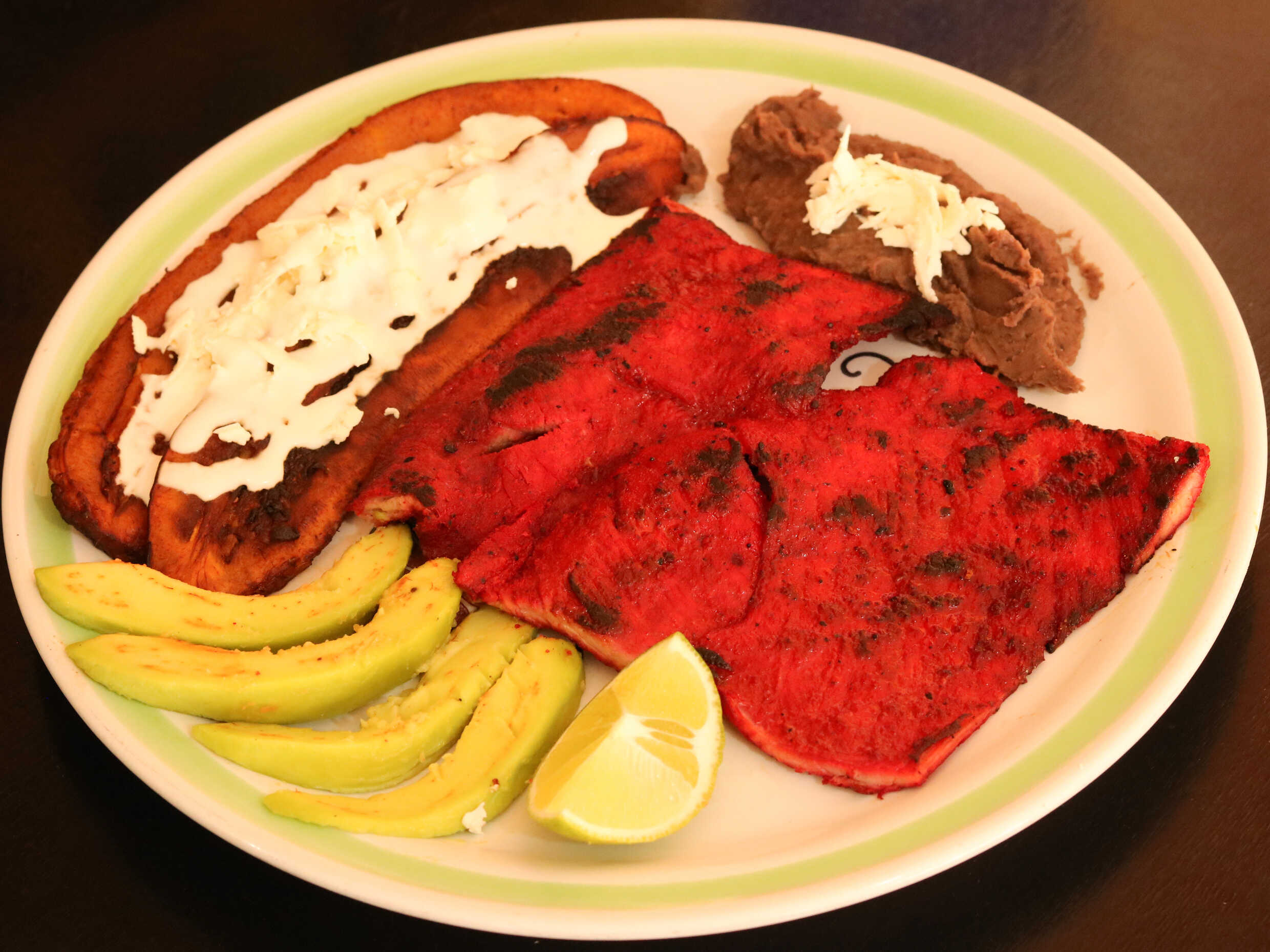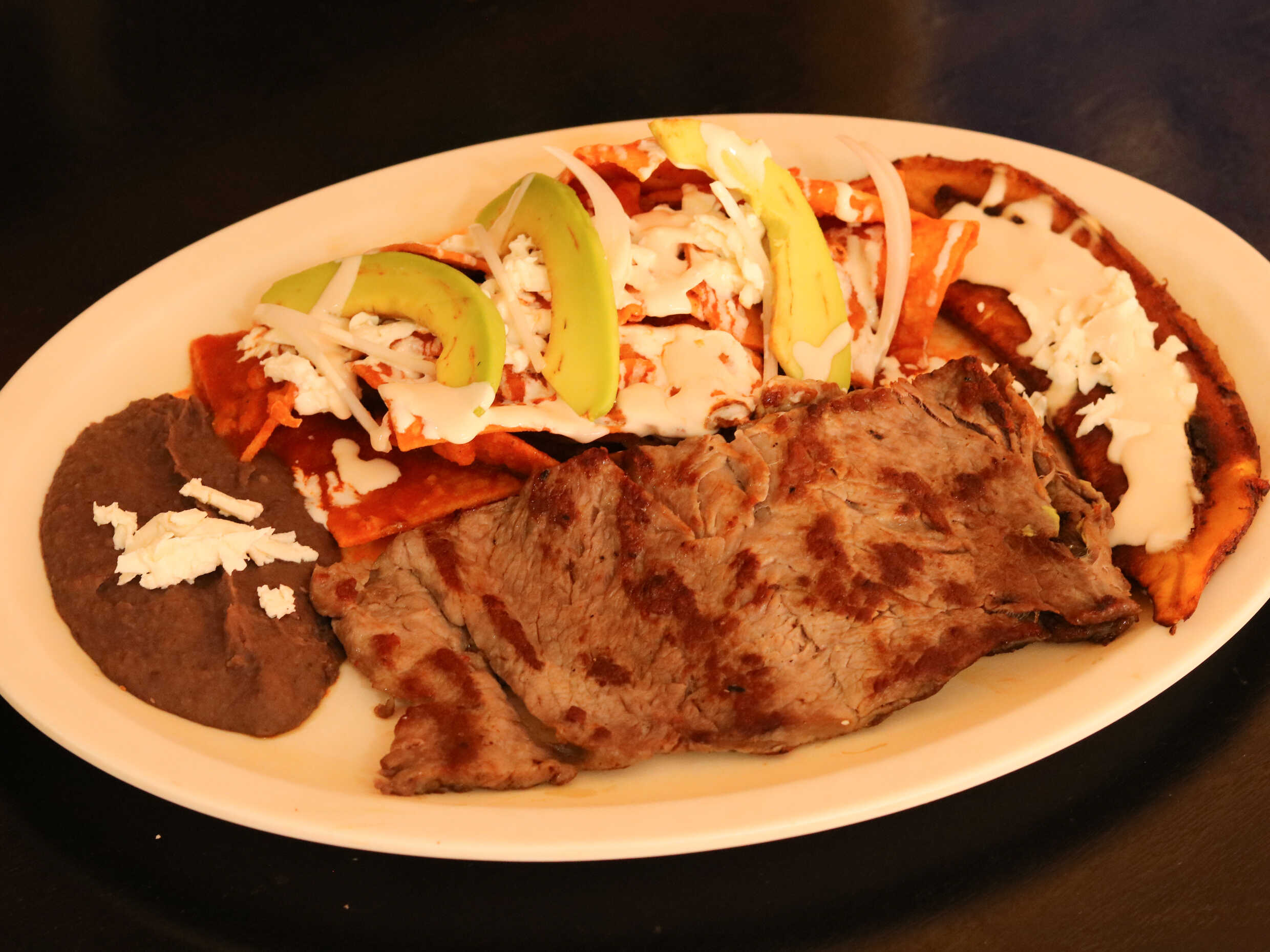 200 gr de carne de res asada ,platano frito ,chilaquiles ( queso ,crema,cebolla y aguacate)