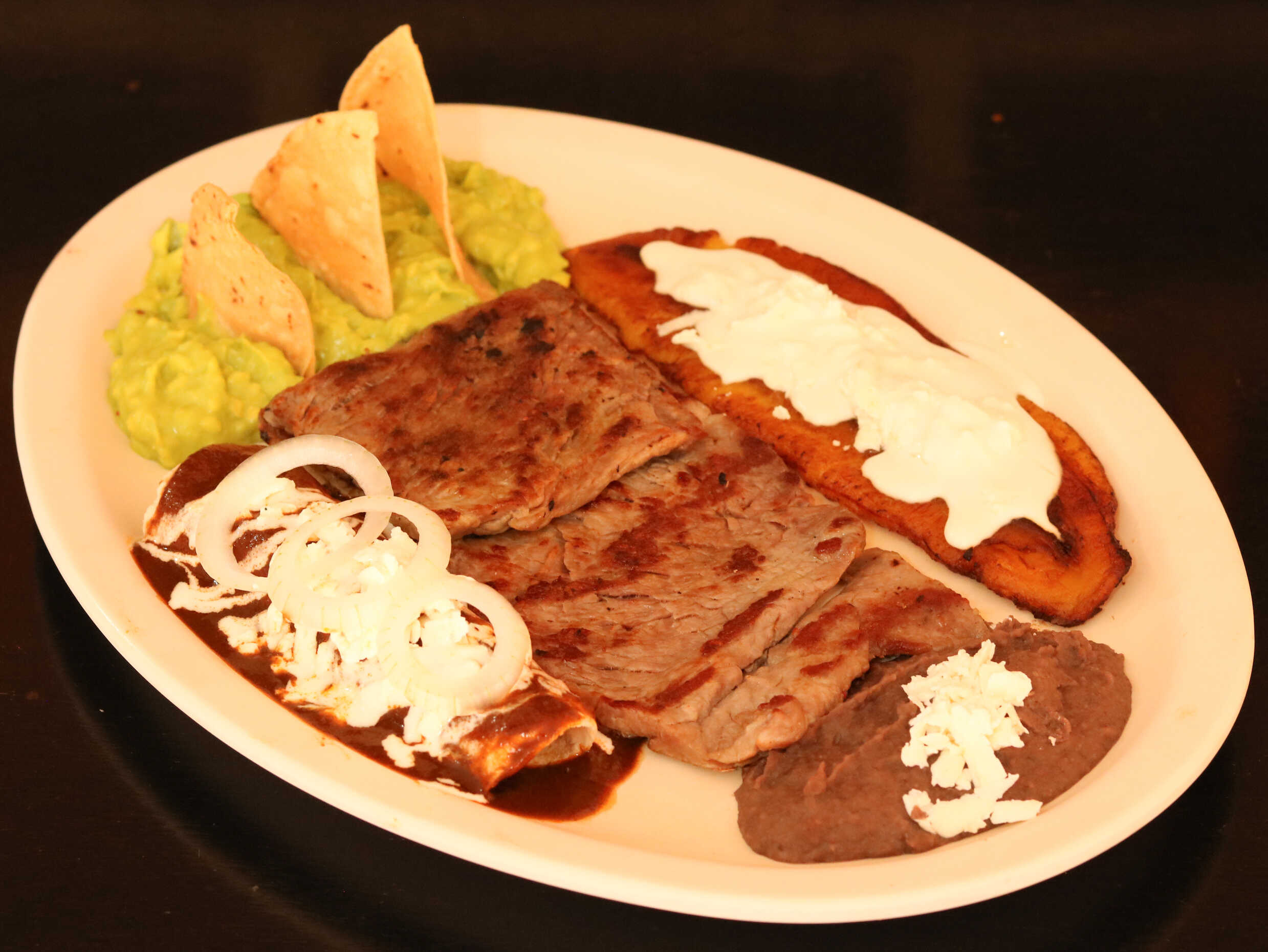 200 gramos de filete de res acompañado de frijoles refritos,platano frito,guacamole,y enchilada de moles