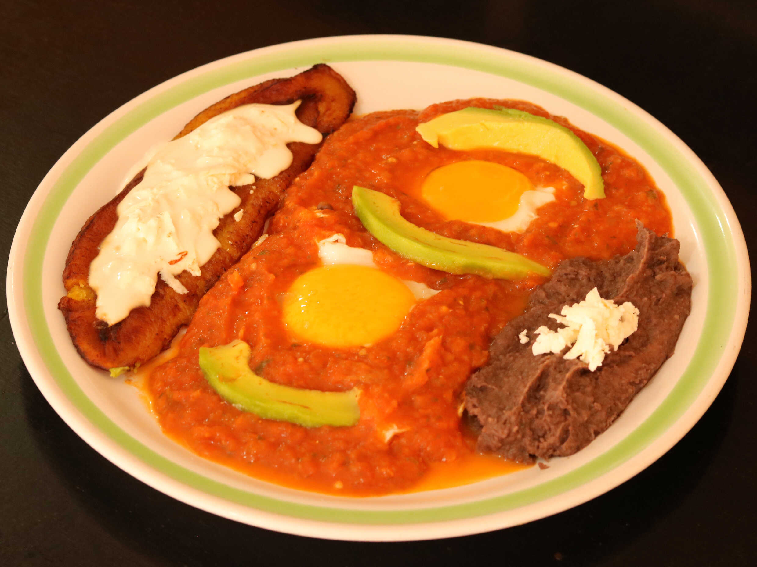 2 huebos estrellados bañado de una salsa incluye (jamon,tocino ,longaniza y cebolla) frijoles refritos y plátano frito ✔