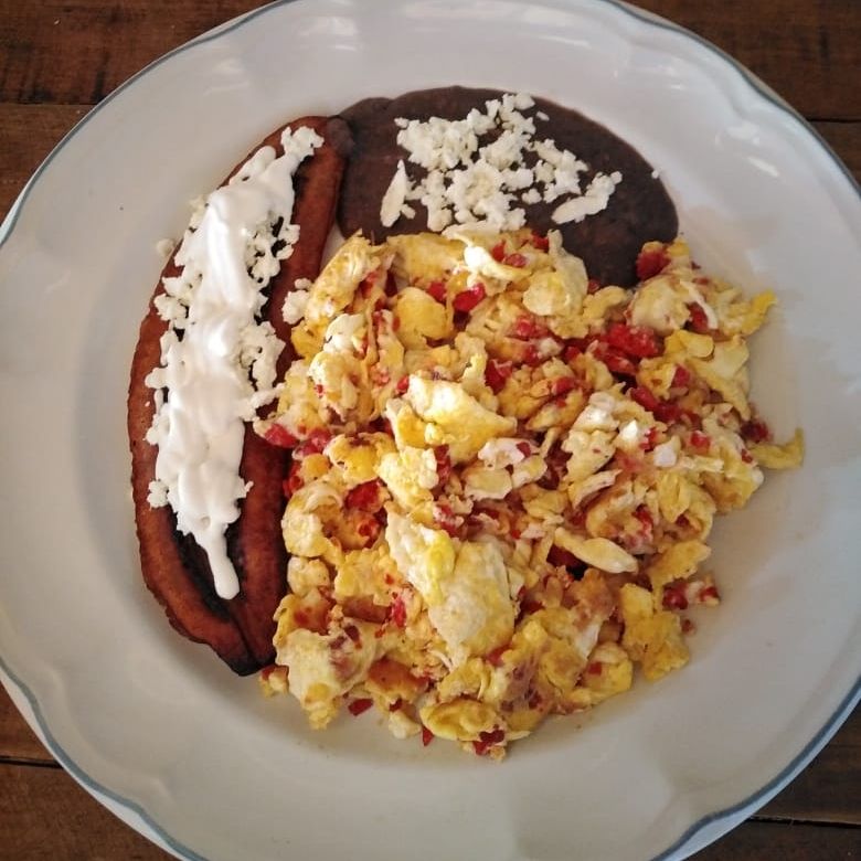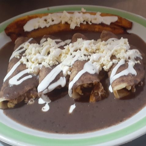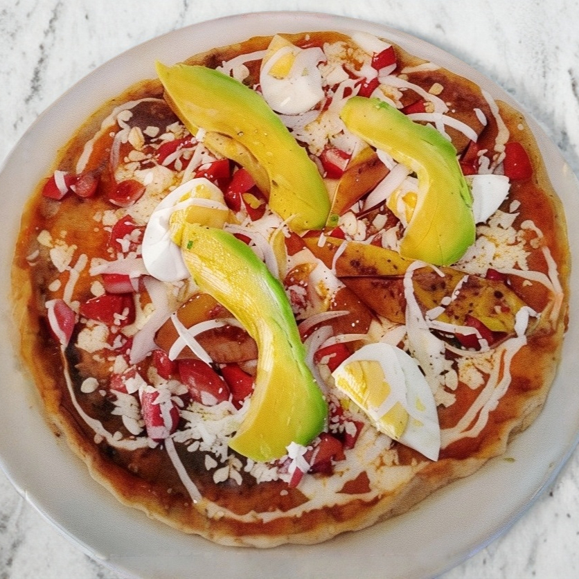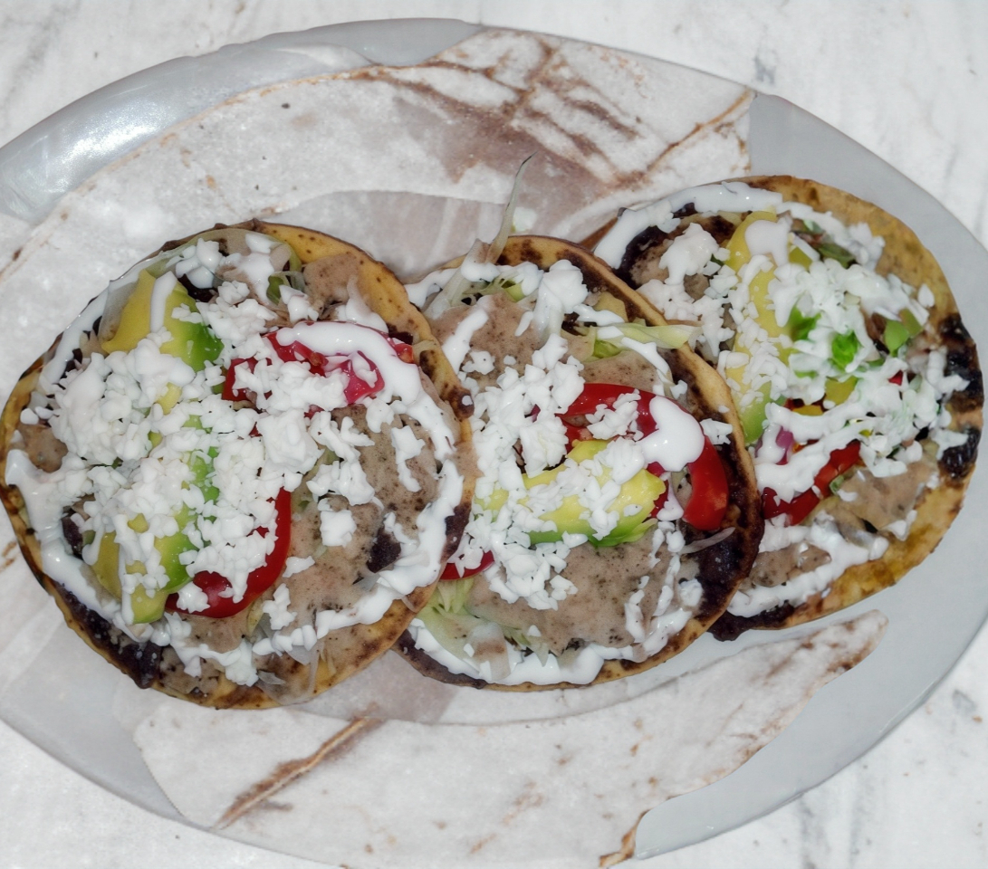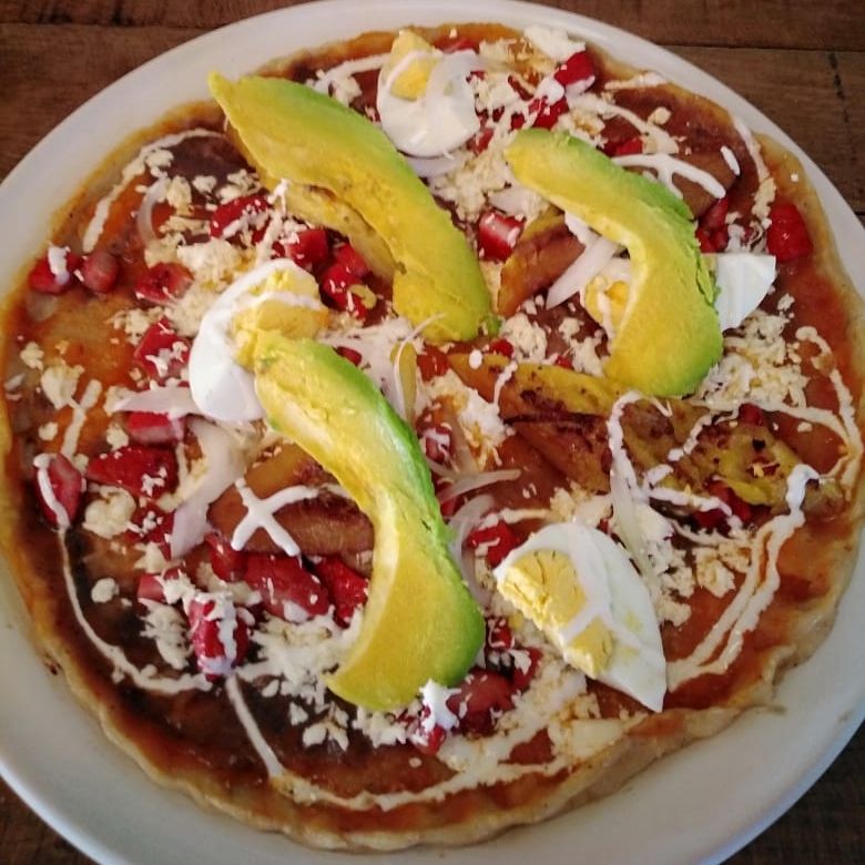 Tortilla de maiz base de frijoles, salsa de tomate , carne que elija (asada de res, chinameca, longaniza, pollo, cochinita,o, picadillo de res ),queso, crema,huevo duro,platano frito,cebolla y aguacate 🥑