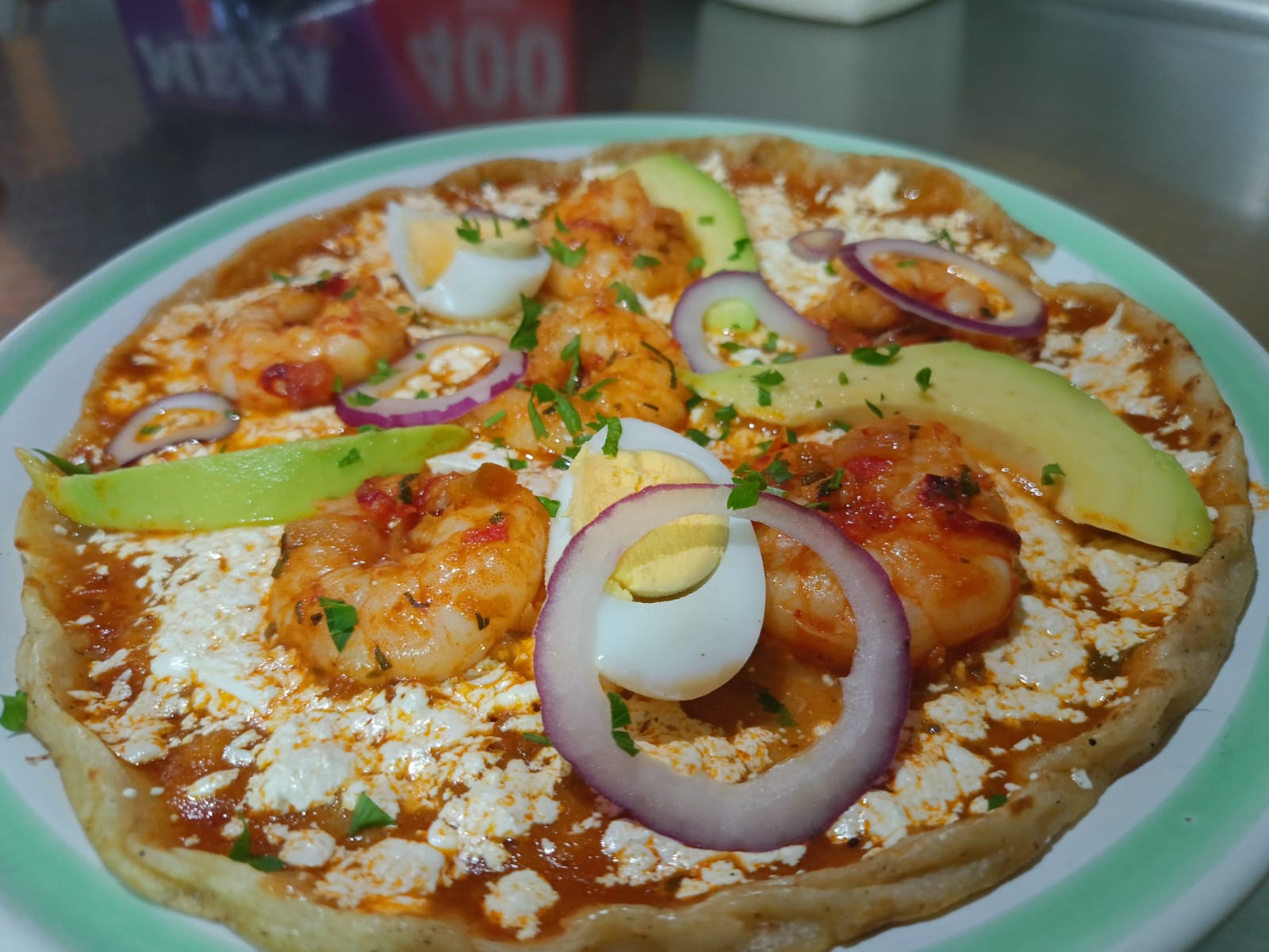 MEMELA DE TORTILLA DE MAIZ CON BASE DE SALSA DE TOMATE Y QUESO OAXACA GRATINADO INCLUYE CAMARONES UNA PIEZA DE HUEVO HERVIDO CEBOLLA Y AGUACATE