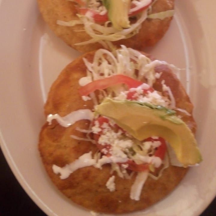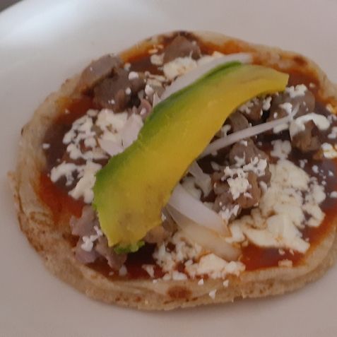Una tortillita con base de frijoles ,salsa roja de tomate,la carne que elija ,queso ,cebolla y aguacate
