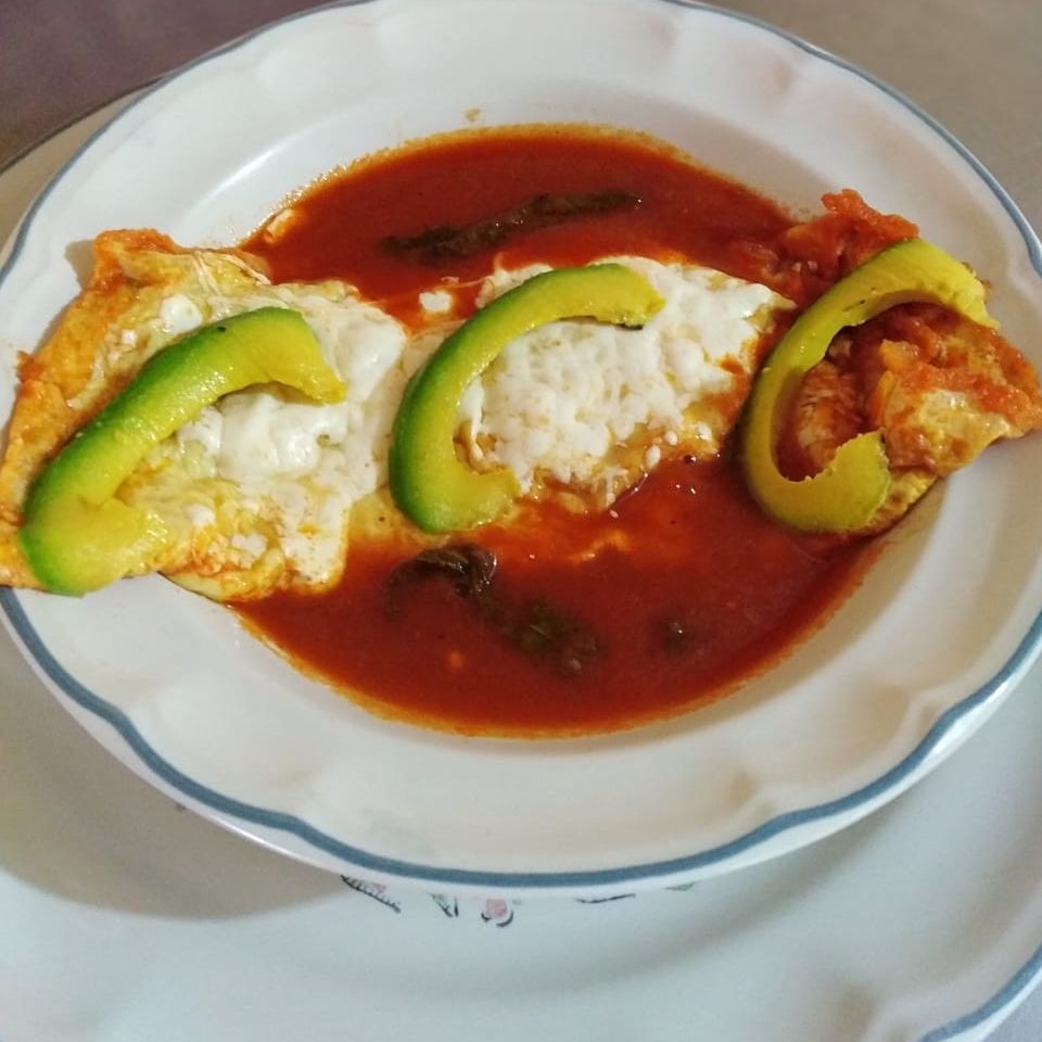 2 piezas de Huevo en torta ahogado en salsa de tomate con epazote acompañado de queso oaxaca gratinado y aguacate 🥑