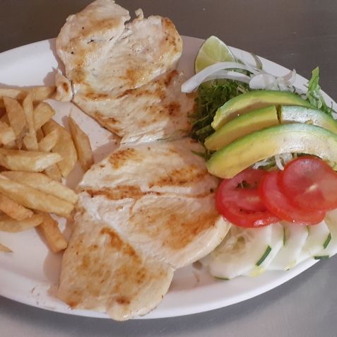 Papas fritas y ensalada ( lechuga, tomate, cebolla y aguacate) 200 gr de pechuga asada a la plancha