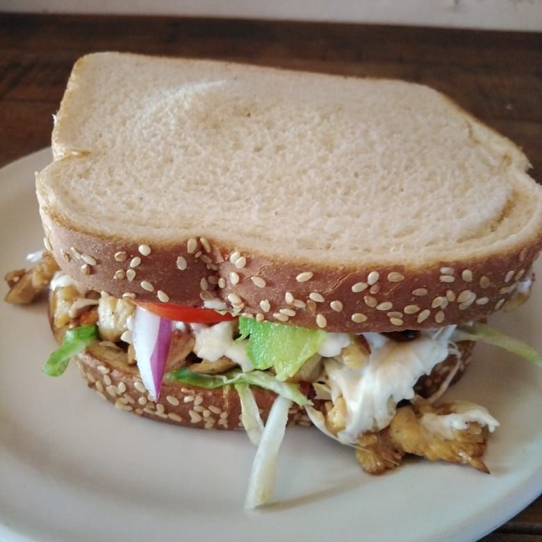 Pan integral, pechuga asada con queso, mayonesa, lechuga, tomate, cebolla, aguacate y chiles curtidos)