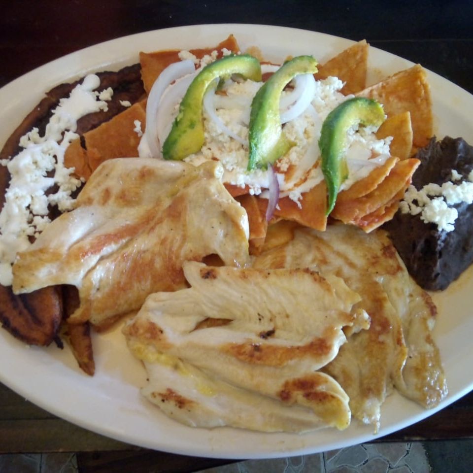 200 gr de pechuga de pollo asada , frijoles refritos ,plátano frito y chilaquiles ( queso ,crema,cebolla y aguacate).