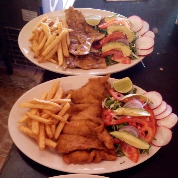 250 gramos de milanesa de pollo acompañado de papas fritasy ensalada (lechuga, tomate, cebolla y aguacate 🥑)