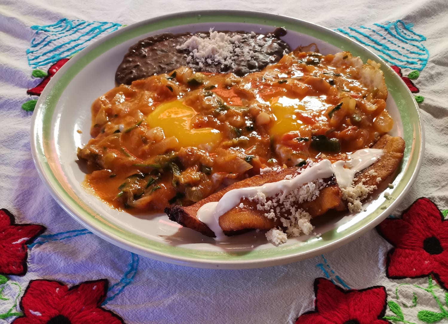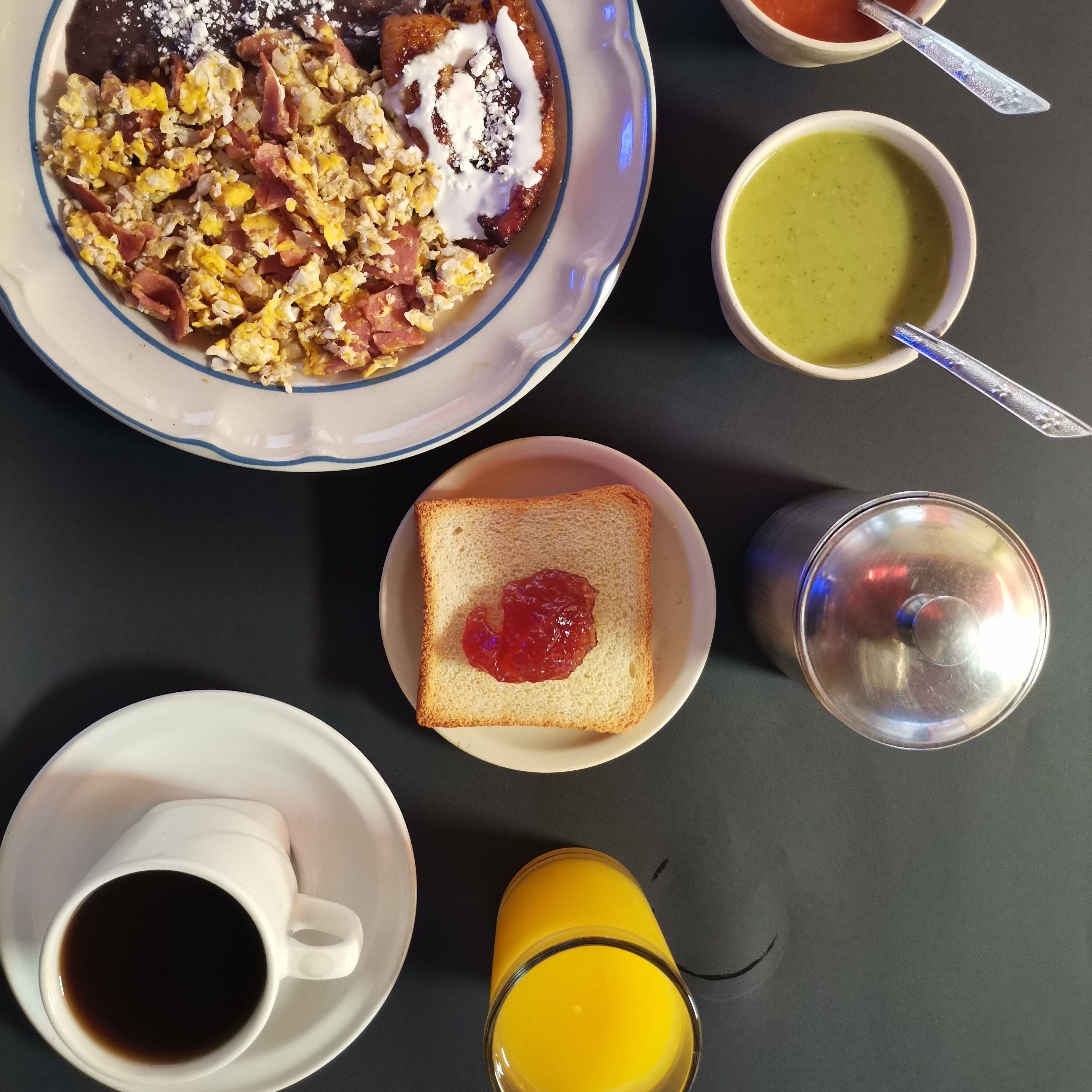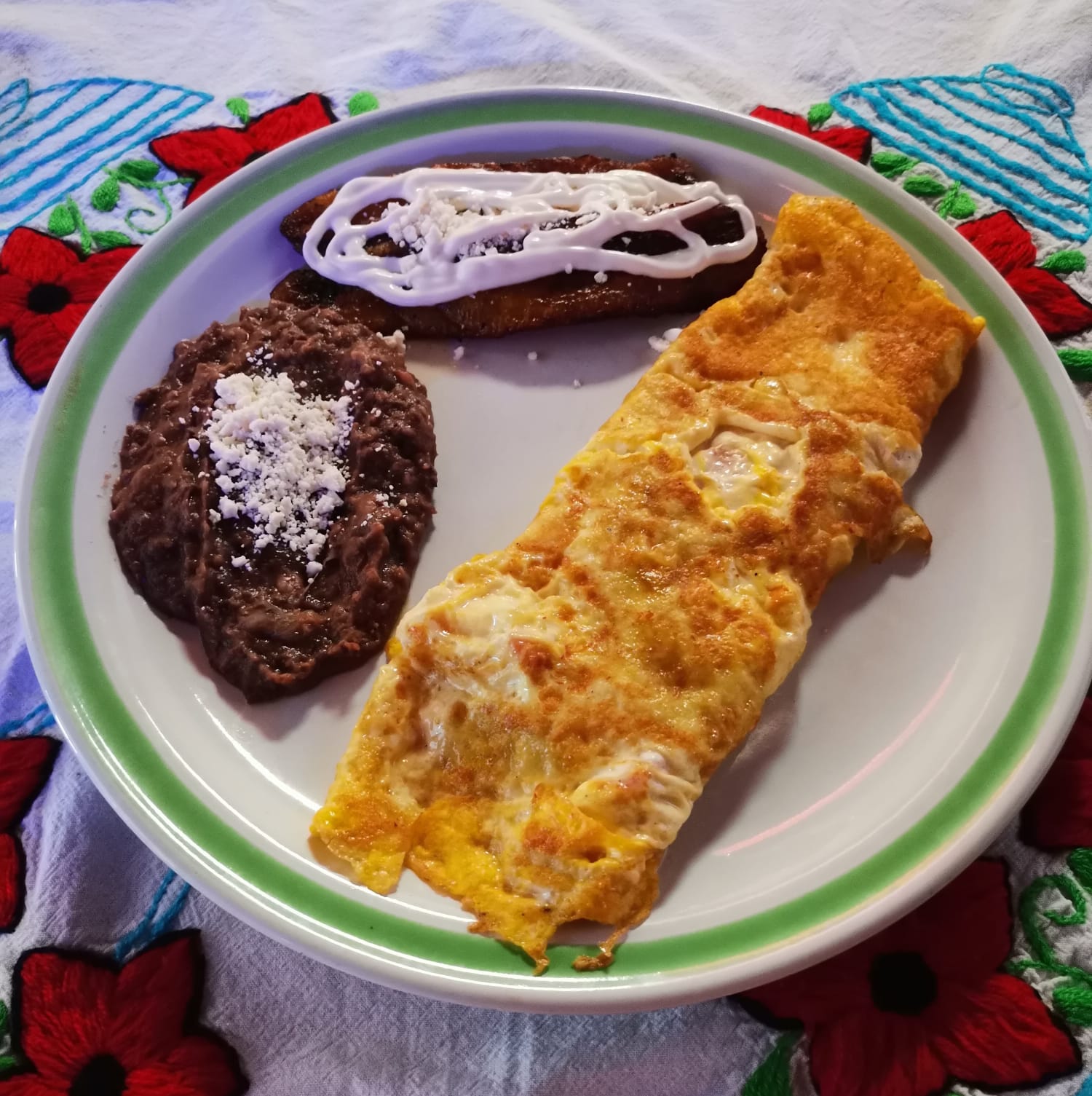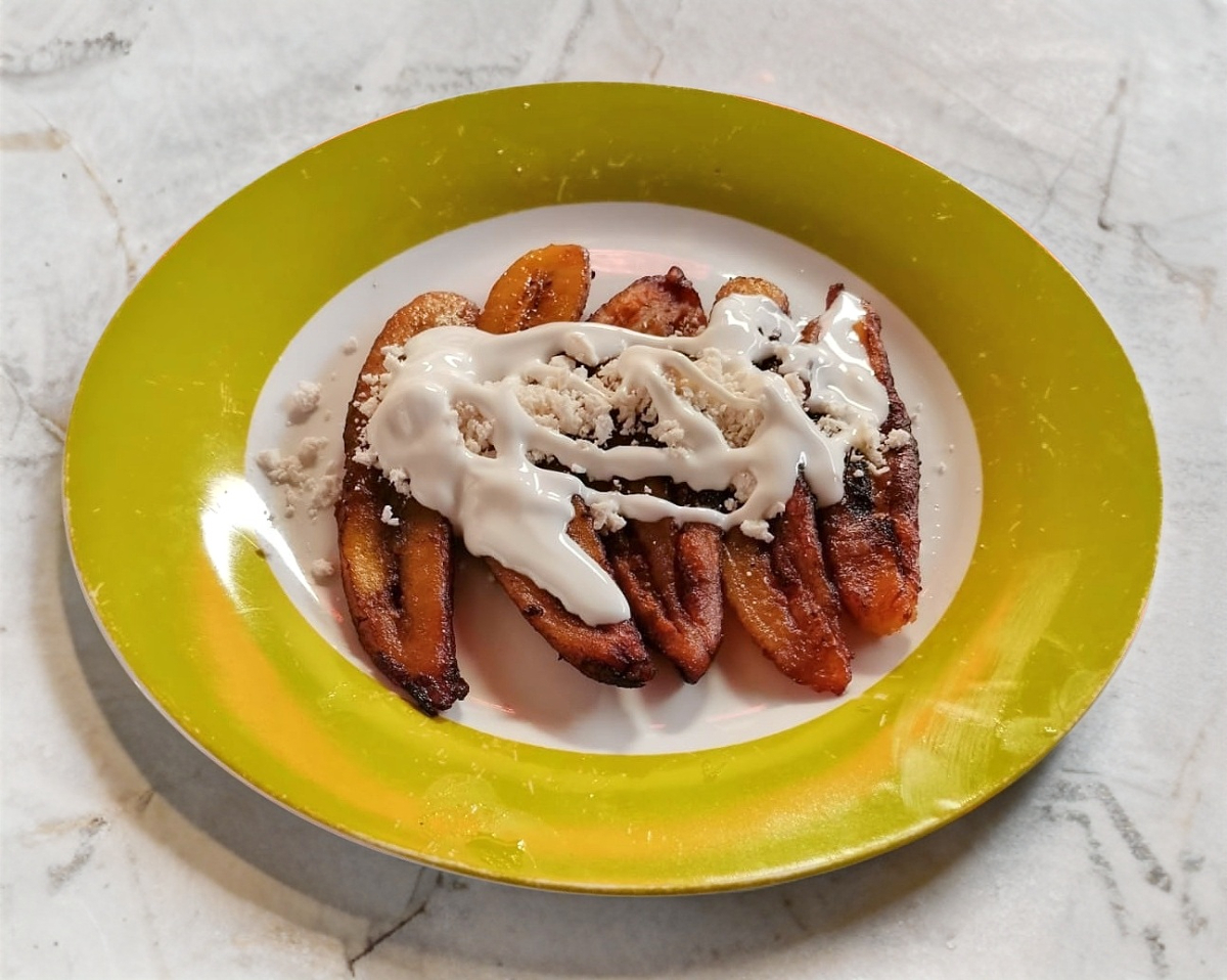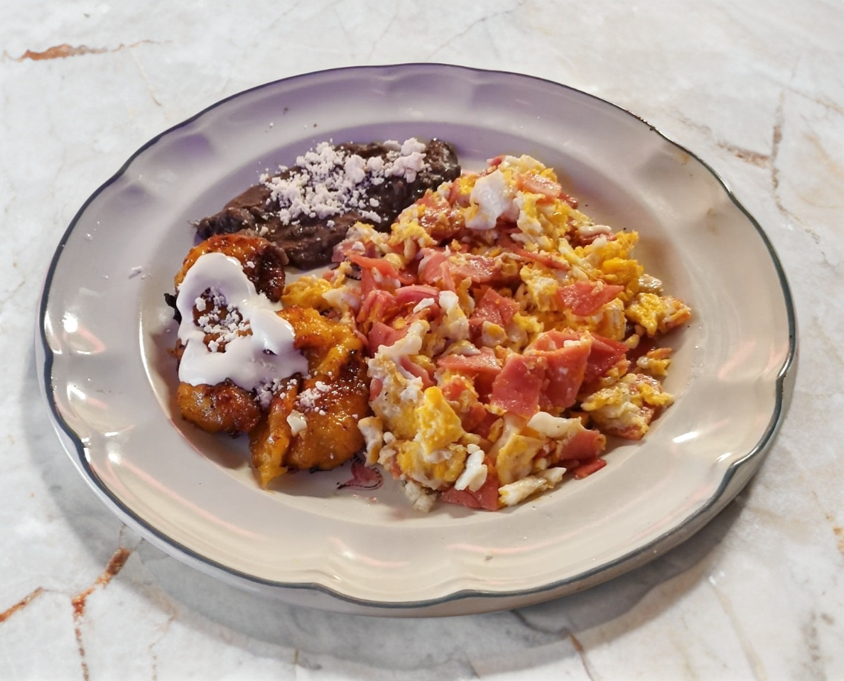 Huevos al gusto, acompañados con frijoles refritos y plátanos fritos con crema y queso.