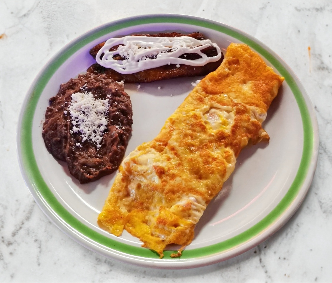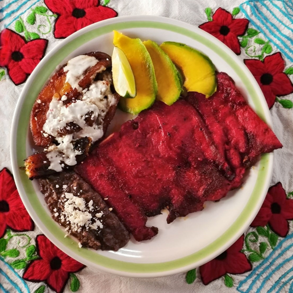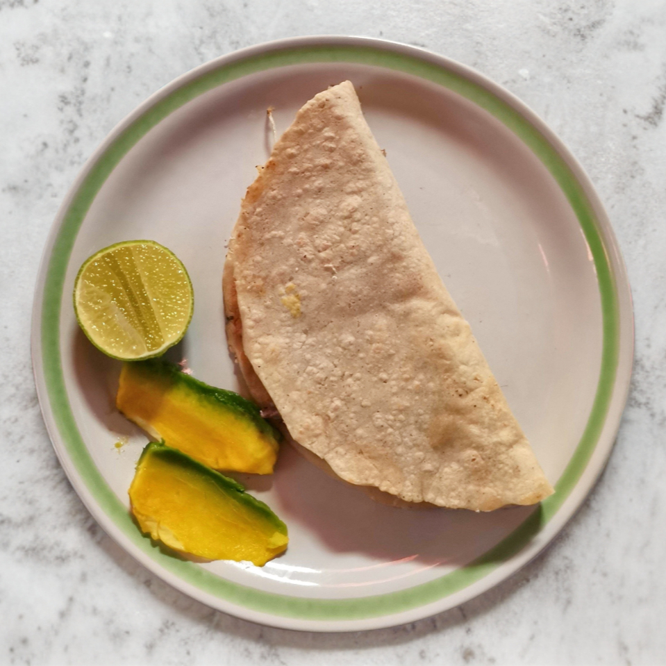Tortilla de maíz con frijoles, plátano, cebolla, queso de hebra, aguacate incluye salsa aparte.(porcion personal)