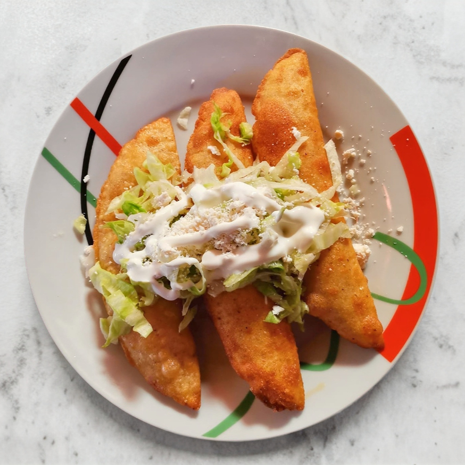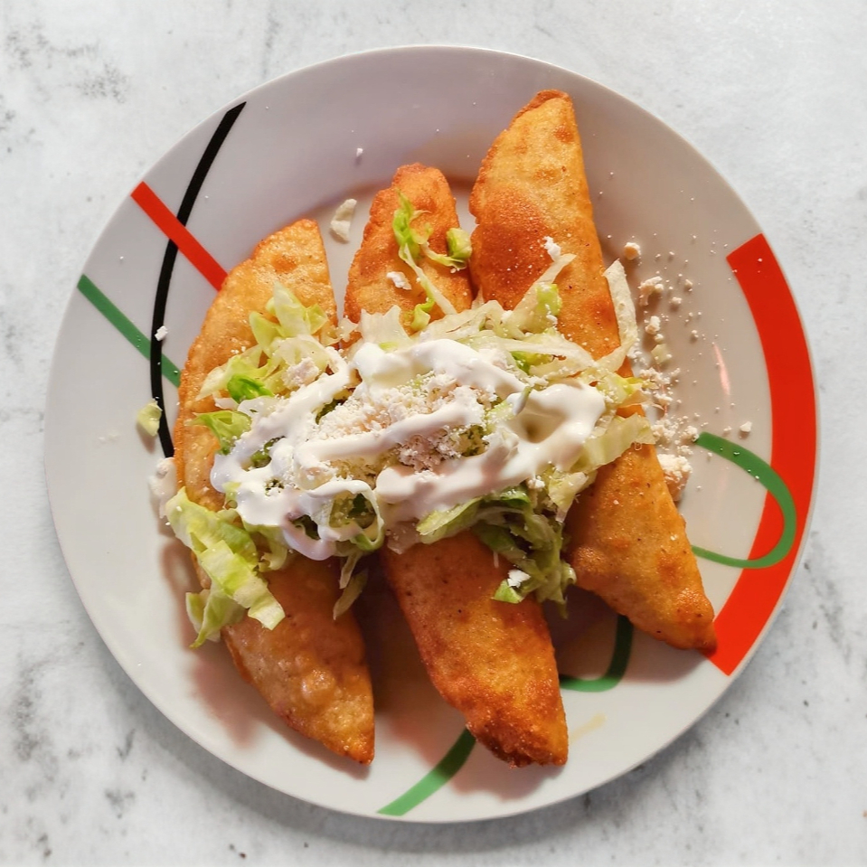 Elige tu relleno. Tres empanadas pequeñas con queso de hebra y lechuga, porción individual.