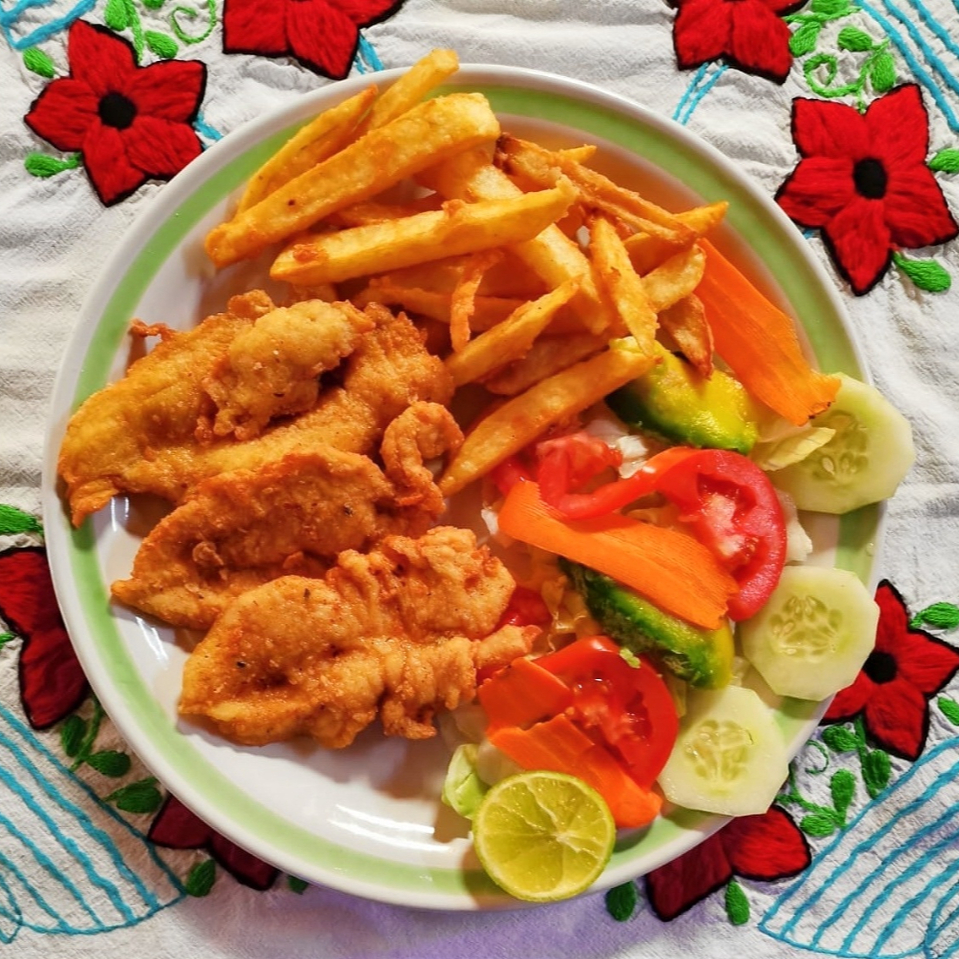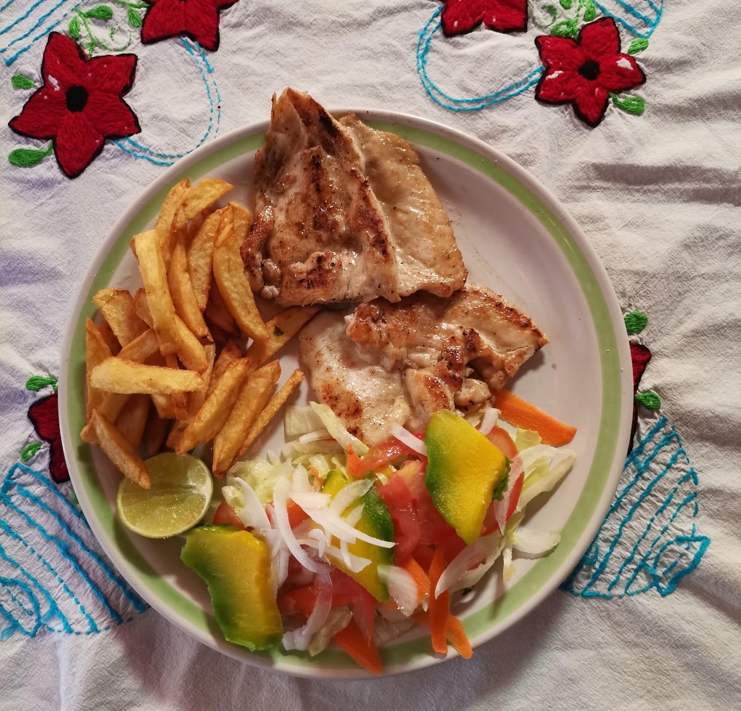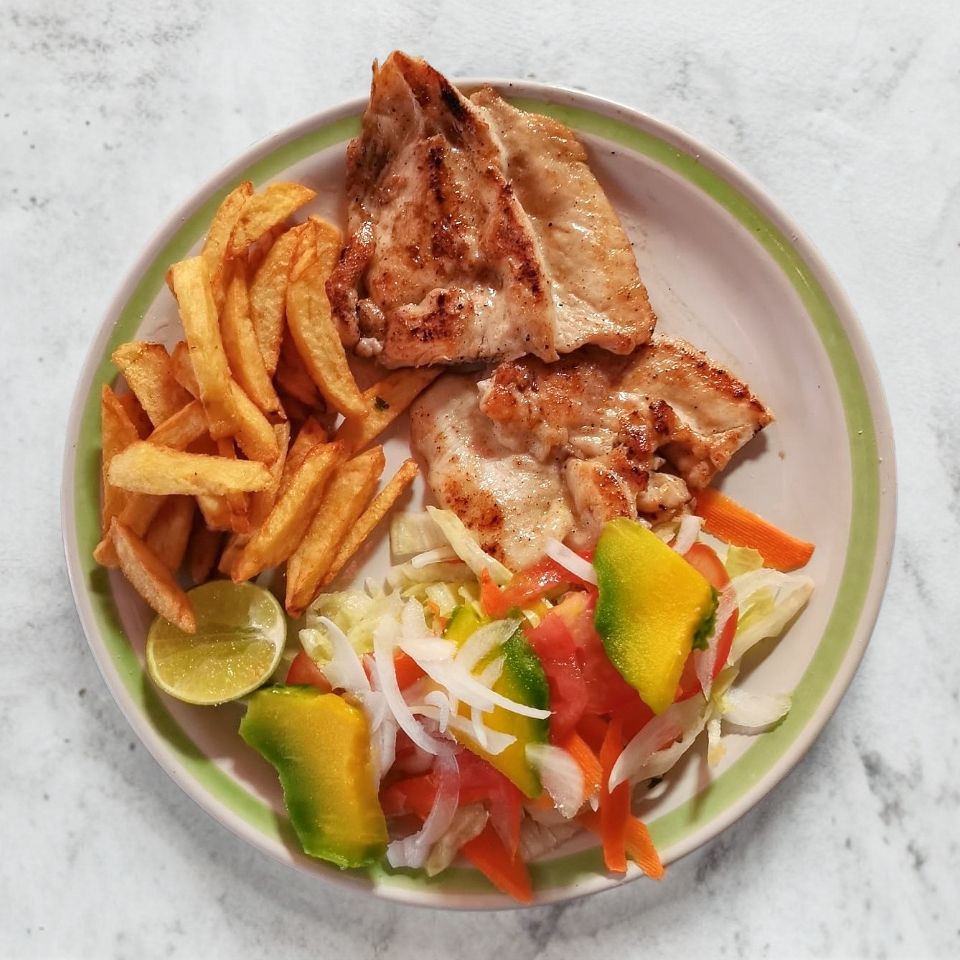 Tortilla ovalada, mateada, frijol plátano frito, huevo cocido, cebolla aguacate y carne(100g). (Porción personal).