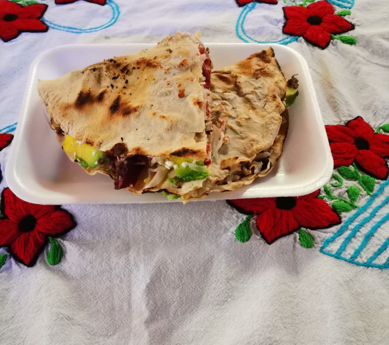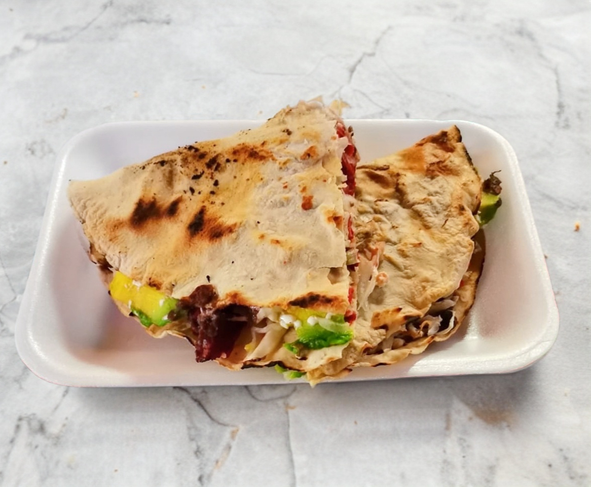 Quesadilla con carne Chinameca, acompañada con lechuga, tomate, cebolla y aguacate.