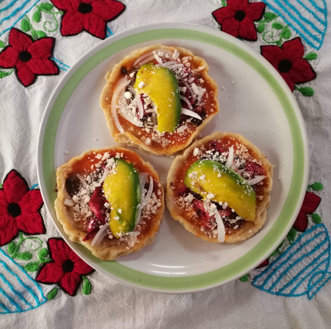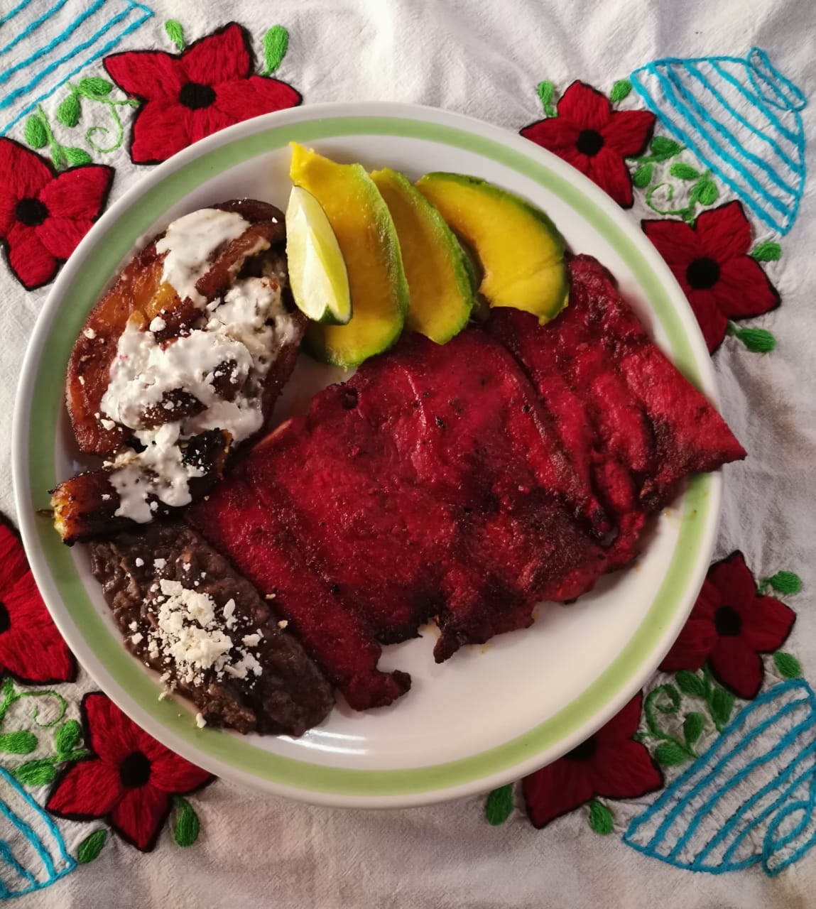 Tortilla de maíz con frijoles, plátano, cebolla, queso de hebra, aguacate y salsa aparte.