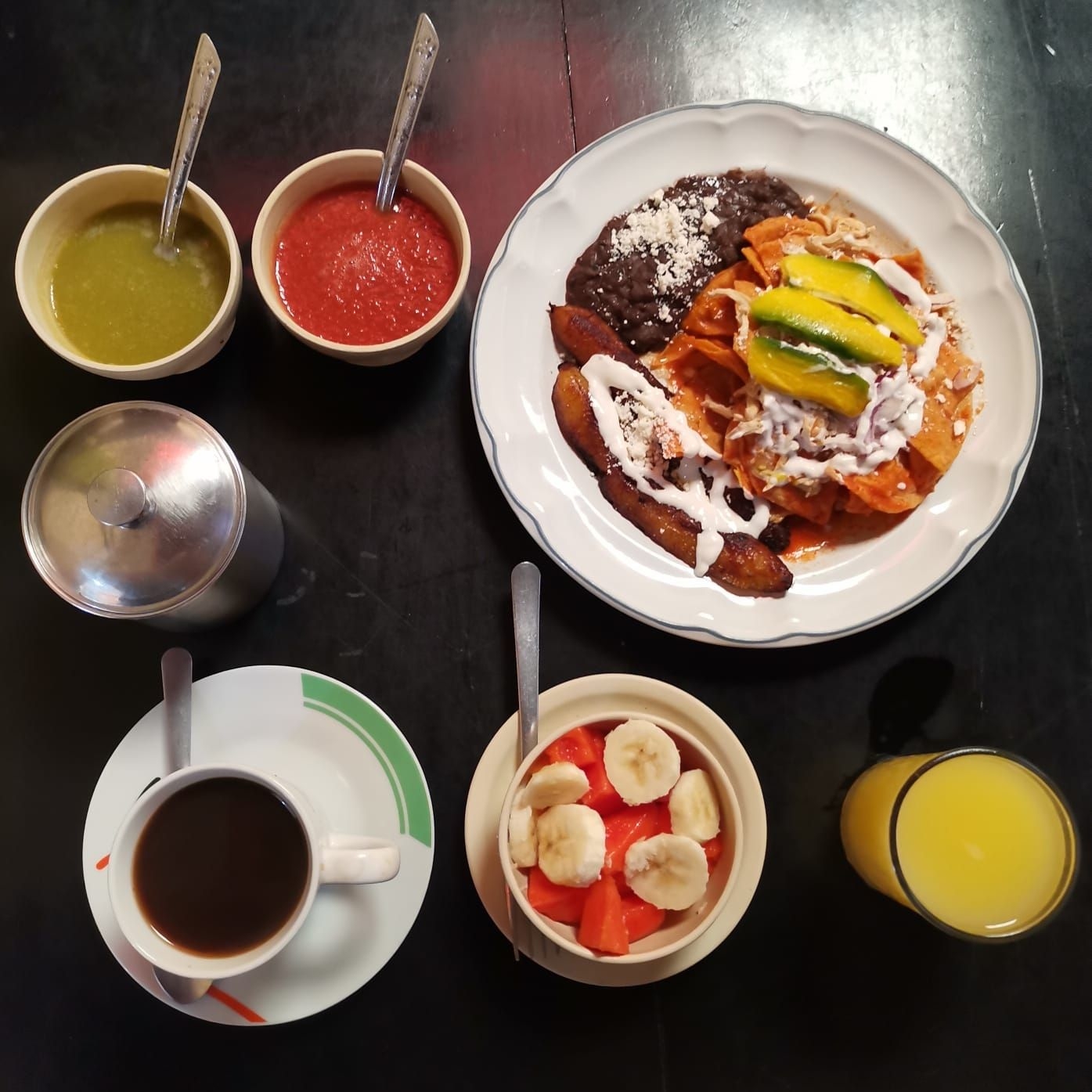 Chilaquiles con Pollo*1 + Tazón de frutas*1 + Jugo de Naranja 250 Ml*1 + Café Americano*1
