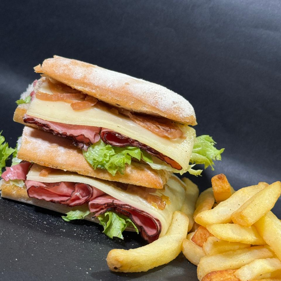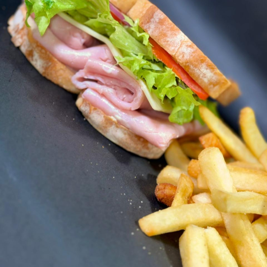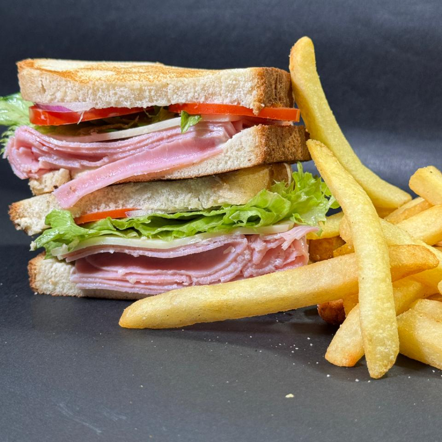 Tradicional Sándwich de Jamón a elegir, con vegetales. Acompañado de Papas a la Francesa.
