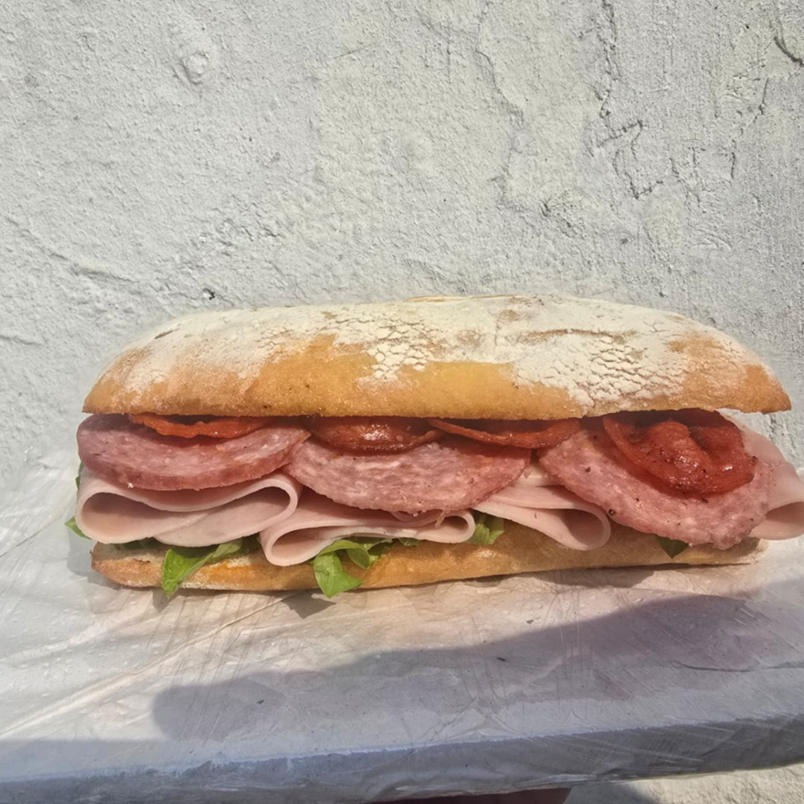 Pan chapata, con salami, chorizo pamplona, jamon de pierna & queso jack. Acompañado con Papas francesa.