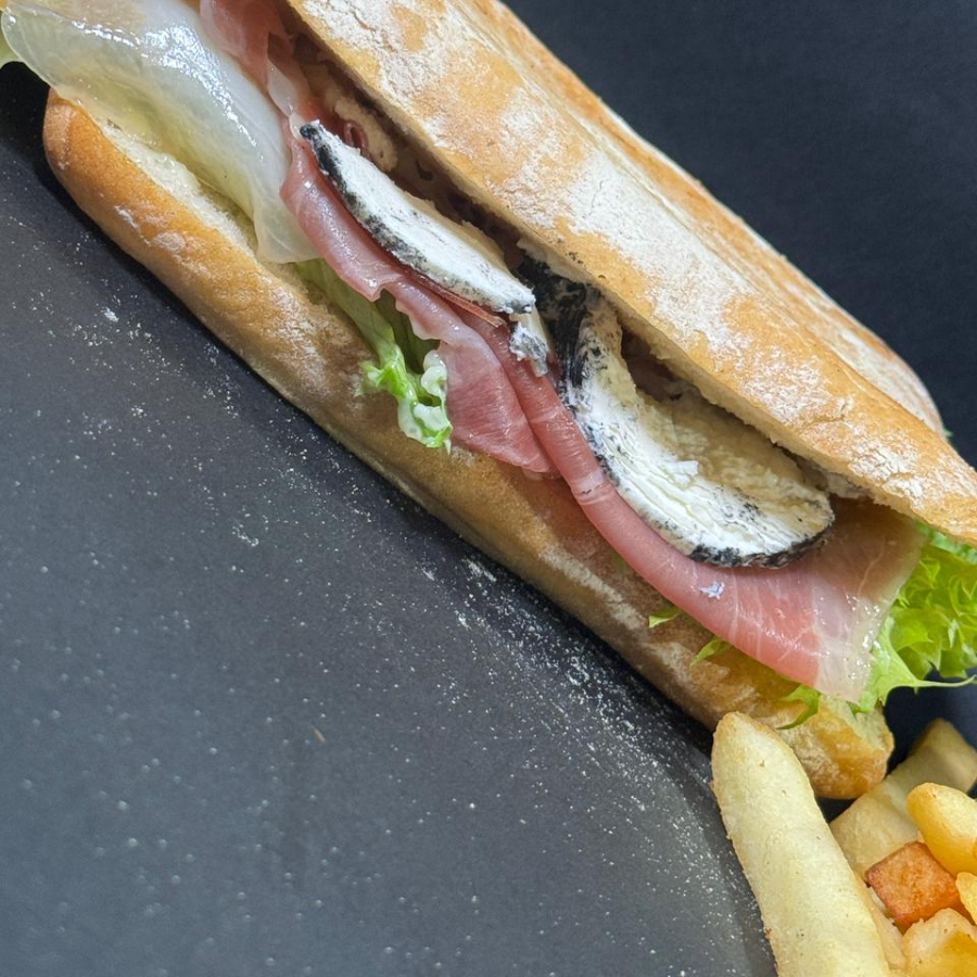 Pan chapata, procciuto, queso de cabra cenizo, lechuga romana, mayonesa de romero, queso jack monterrey. Acompañado de Papas Francesa