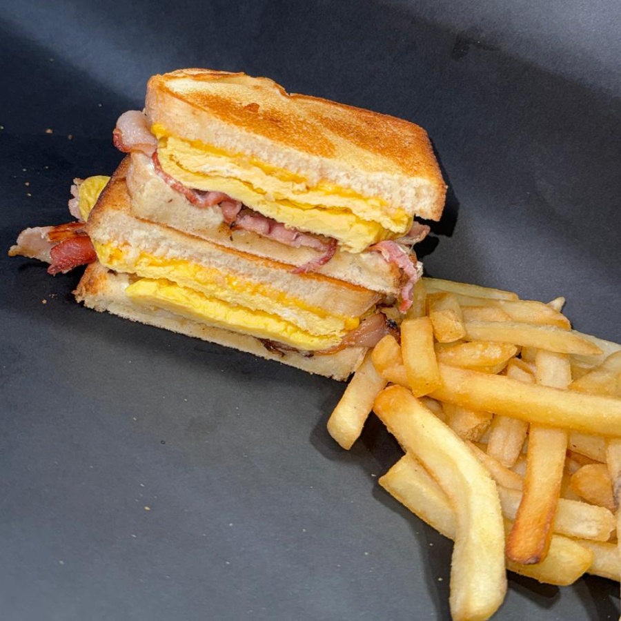 El mejor para desayunar, Tortita de Huevo, queso americano, Bacon y Alioli de ajo. Acompañado de papas francesa.